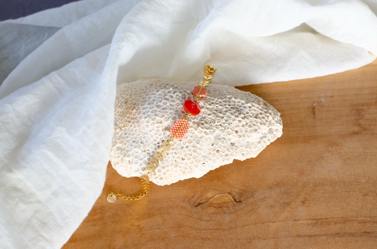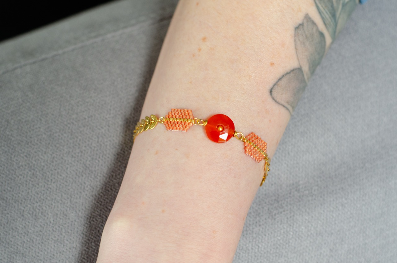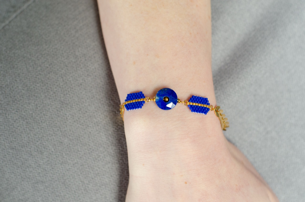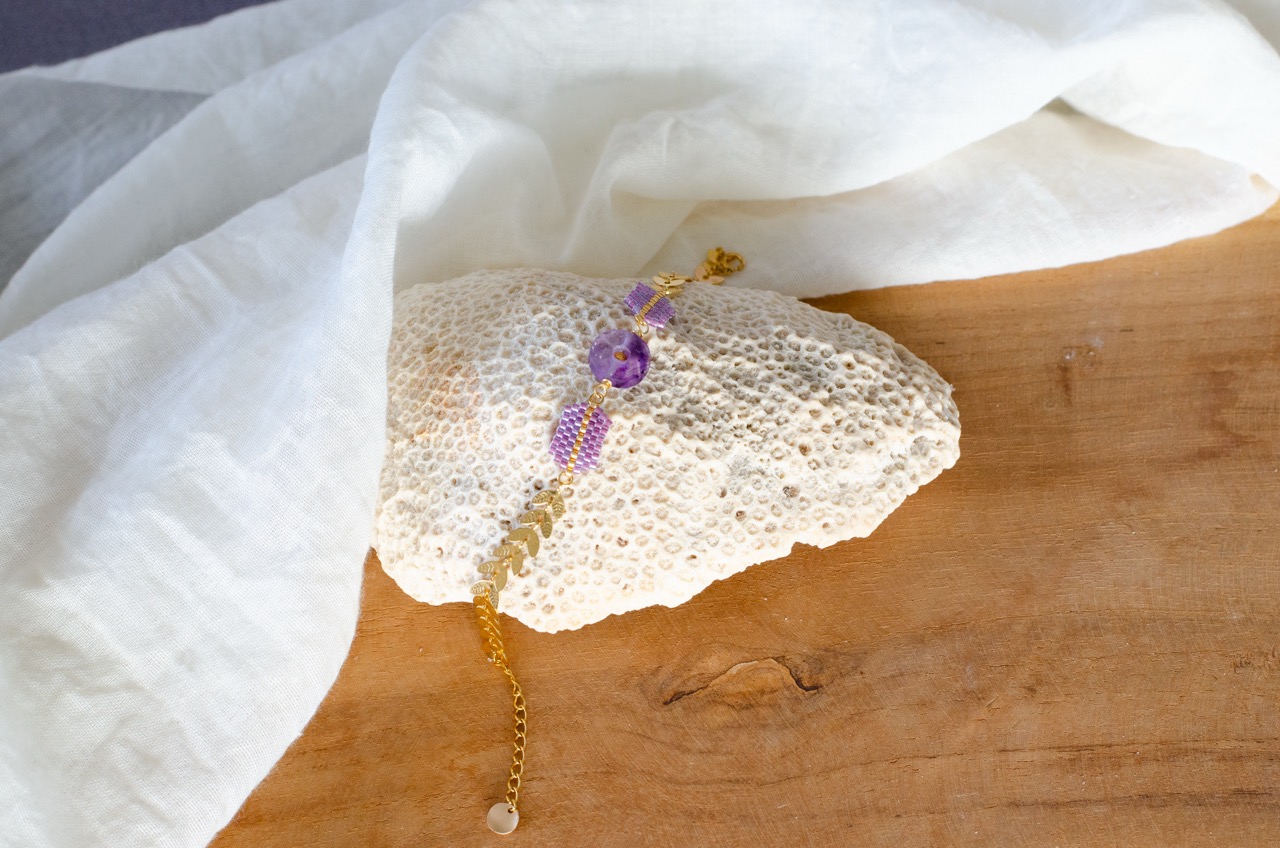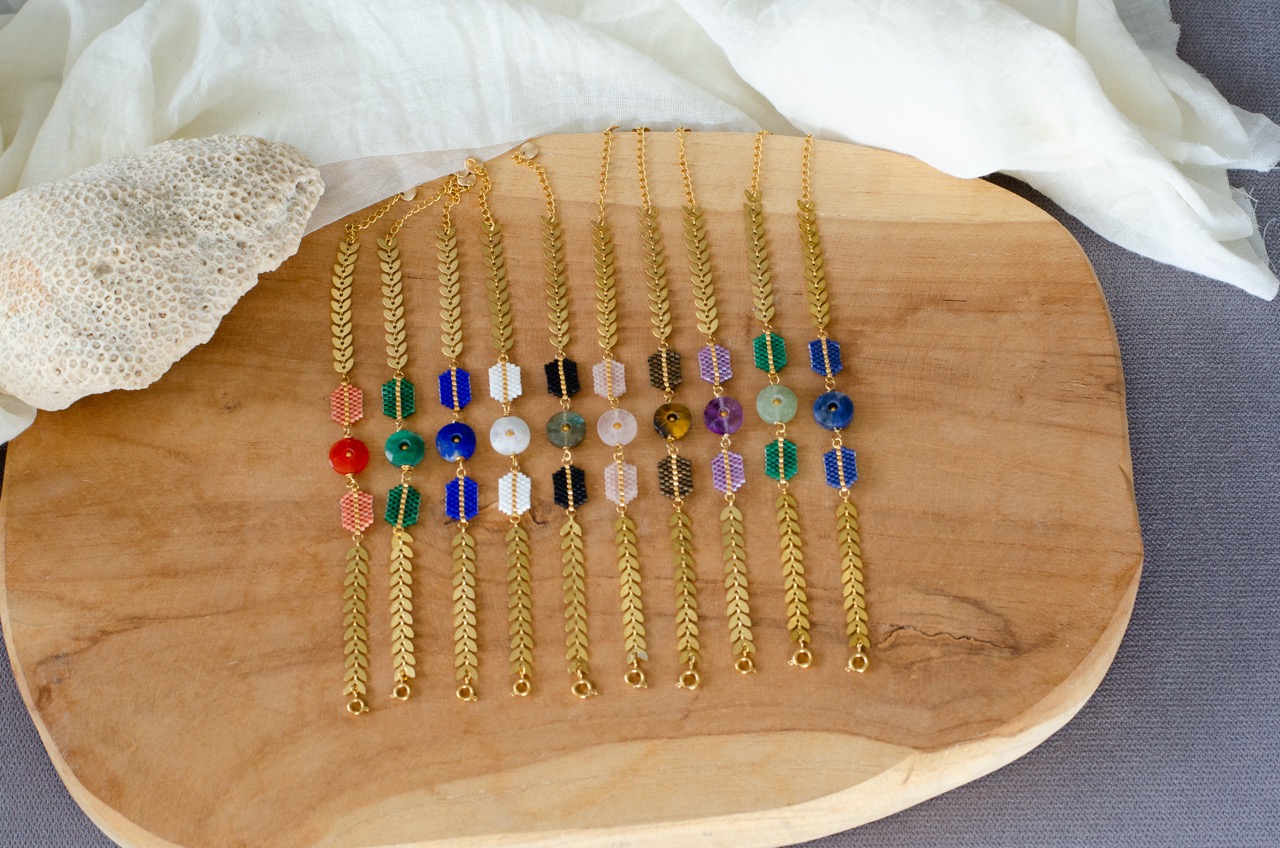 Chaque perle, soigneusement tissée à la main, témoigne du savoir-faire et met en valeur la pièce centrale du bijou, la pierre, et se trouve rappelé par la présence d’une perle plaquée or au centre du cercle de pierre.