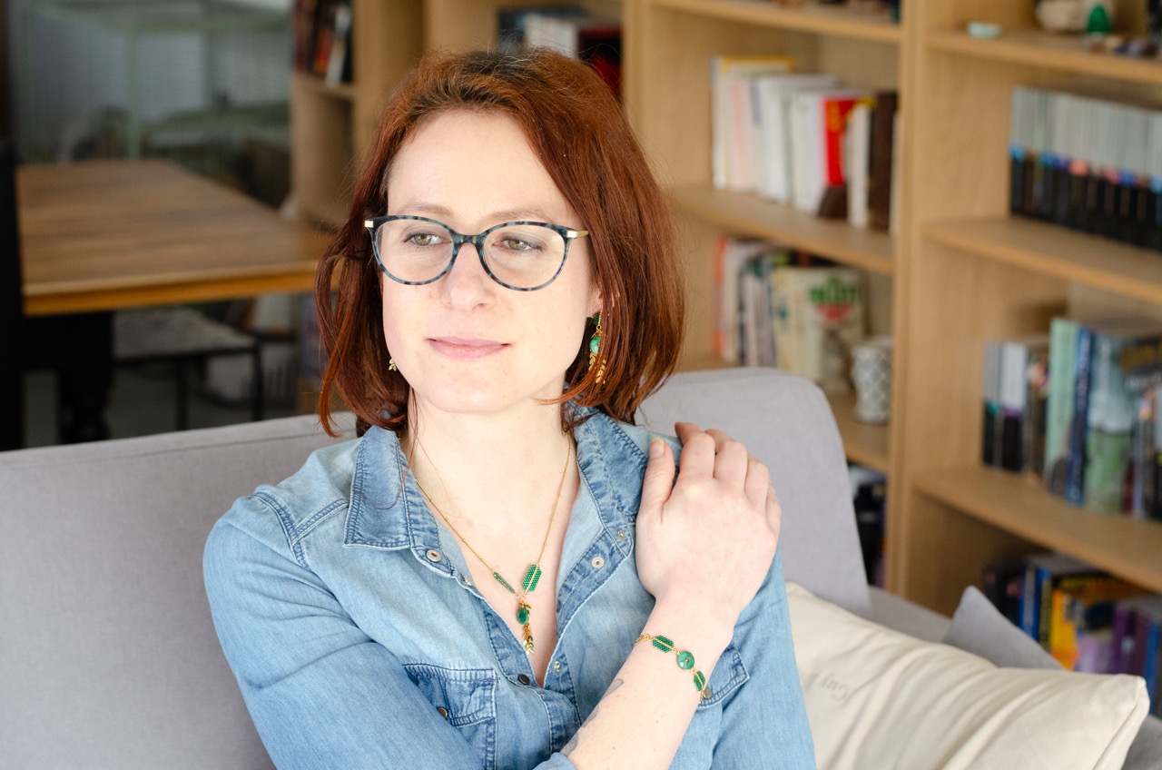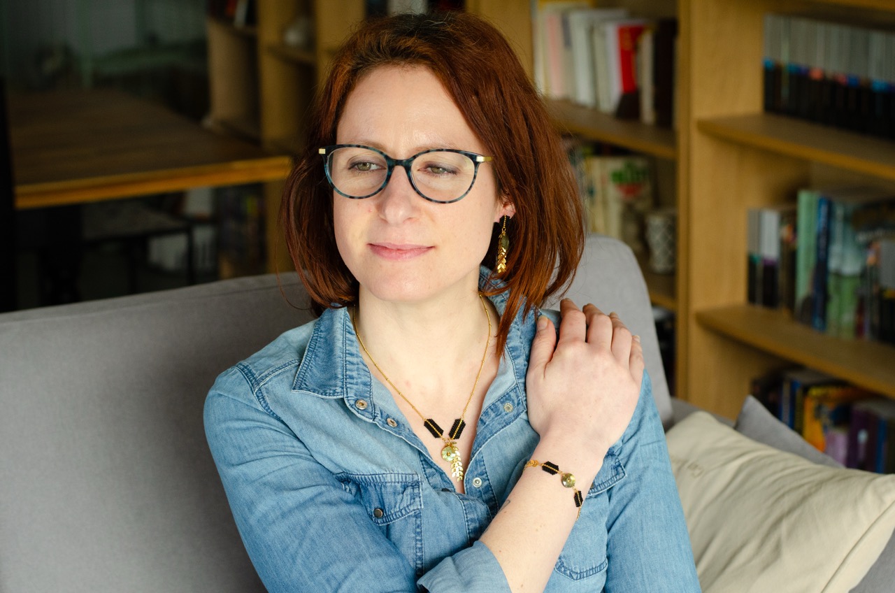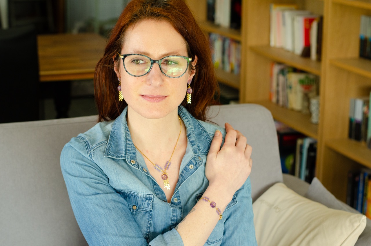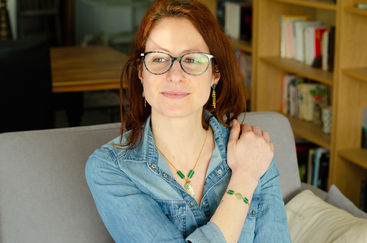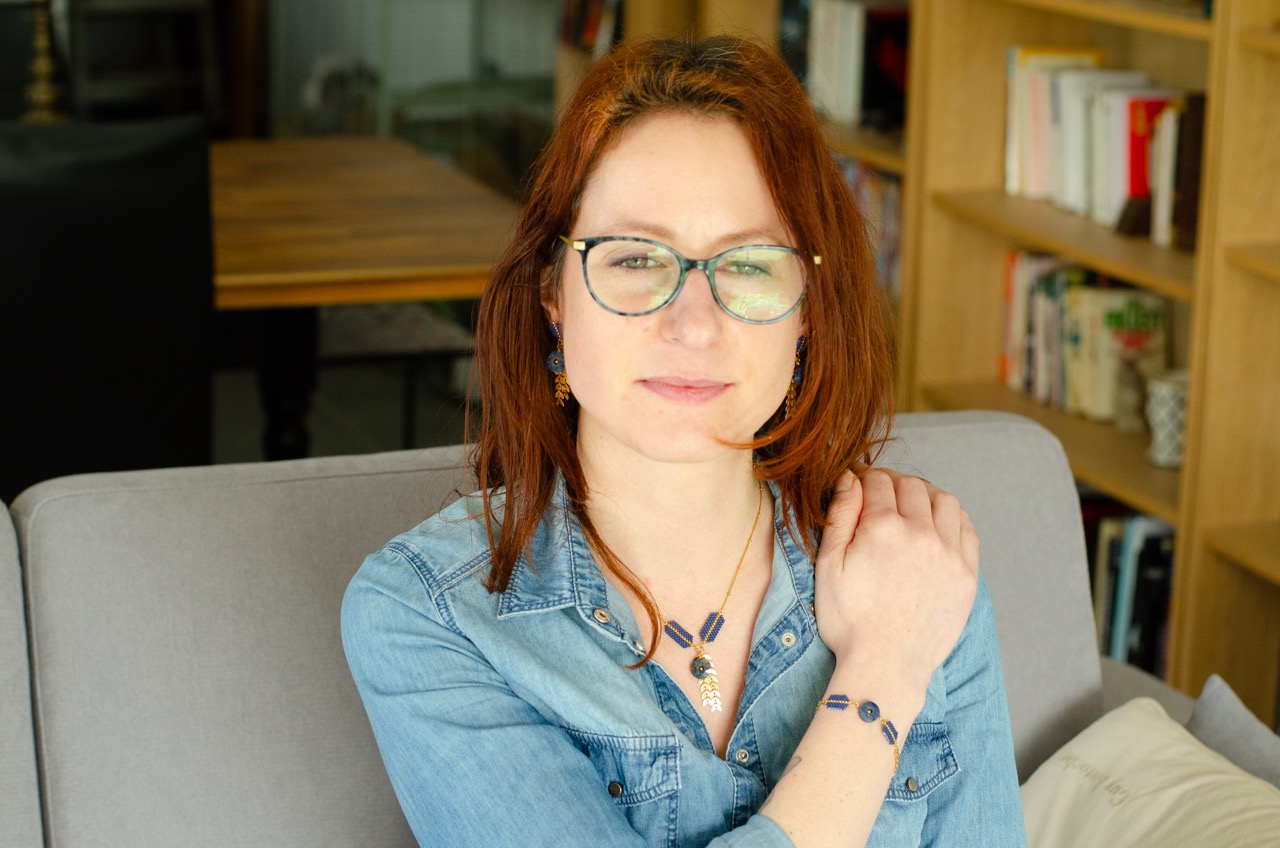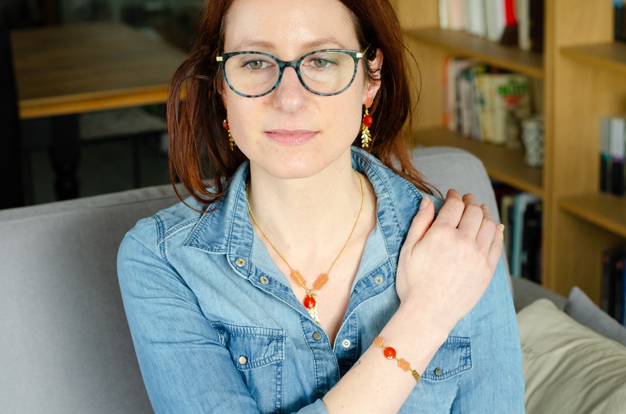 Chaque perle, soigneusement tissée à la main, témoigne du savoir-faire et met en valeur la pièce centrale du bijou, la pierre, et se trouve rappelé par la présence d’une perle plaquée or au centre du cercle de pierre.