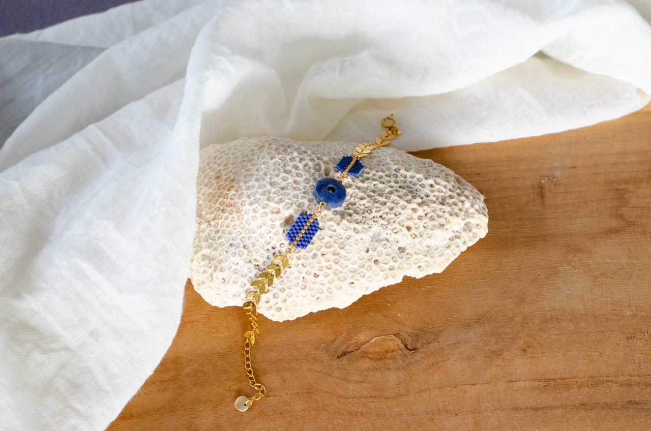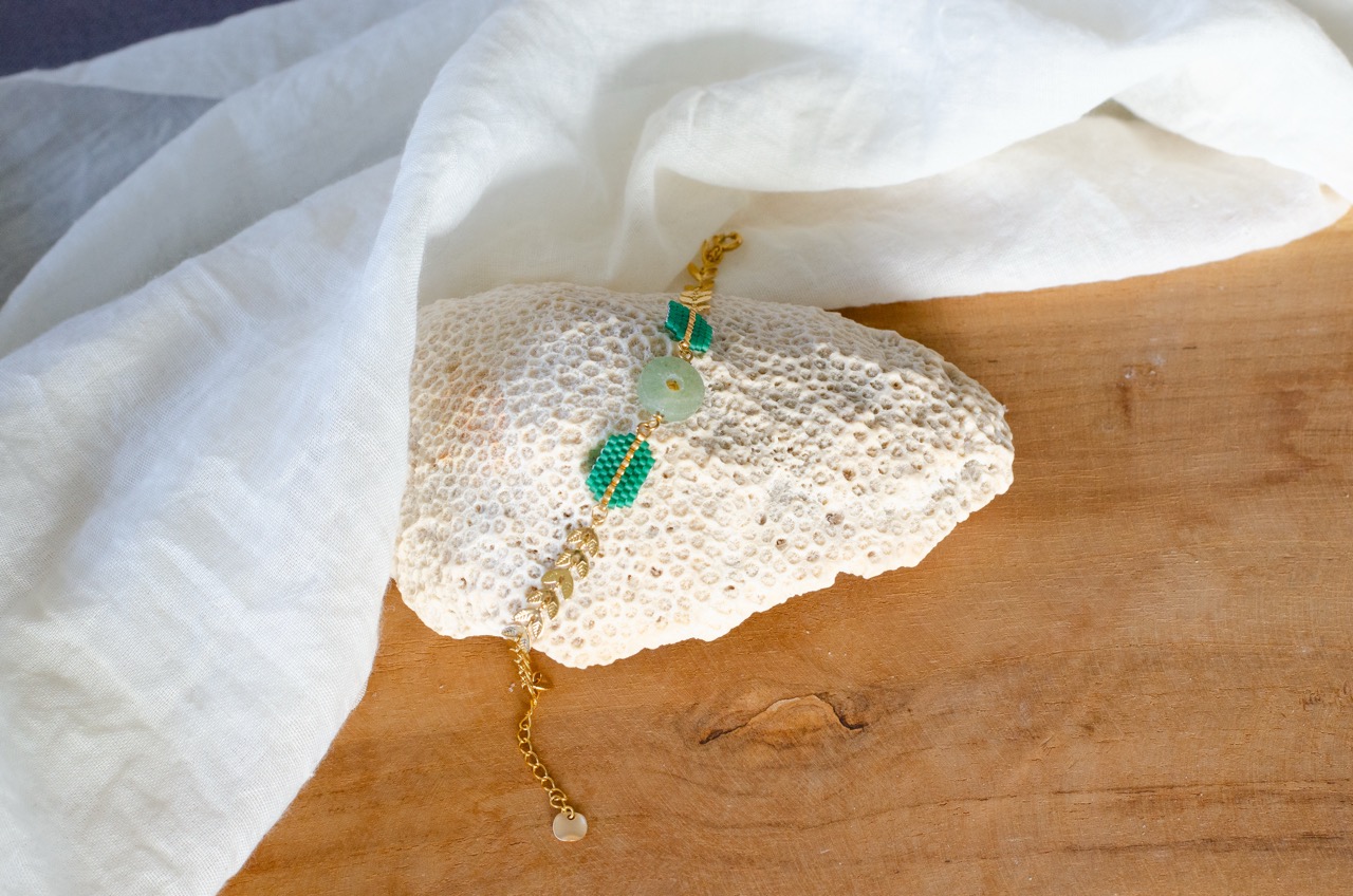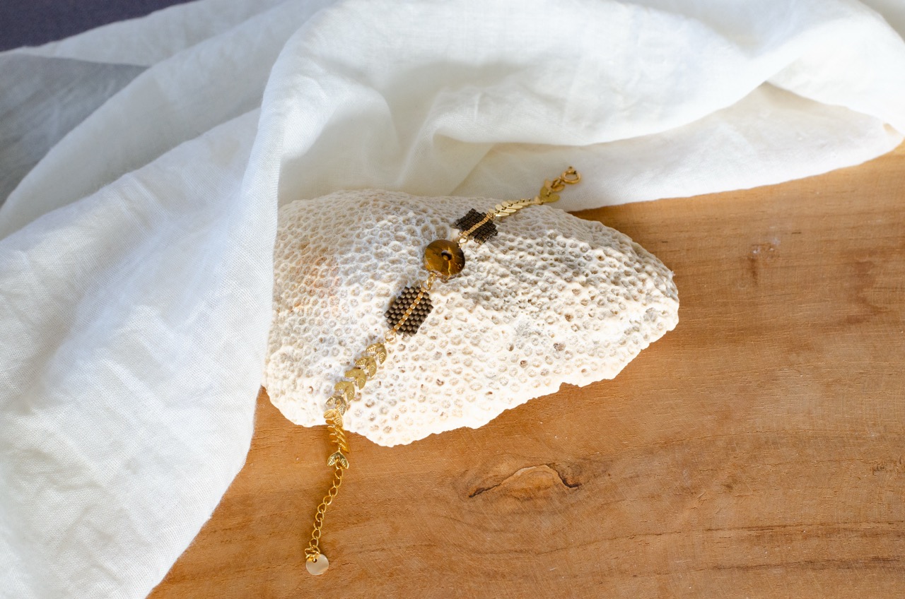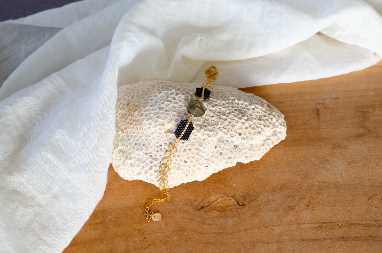 Le bracelet Ava est une création artisanale originale dont le coeur est un cercle en pierre naturelle, encadré par deux tissages de perles japonaises. Le tour de poignet se compose d’une chaîne au motif végétal. Cette association entre la pierre naturelle, le tissage artisanal et le travail du métal offre un contraste saisissant entre tradition et modernité.