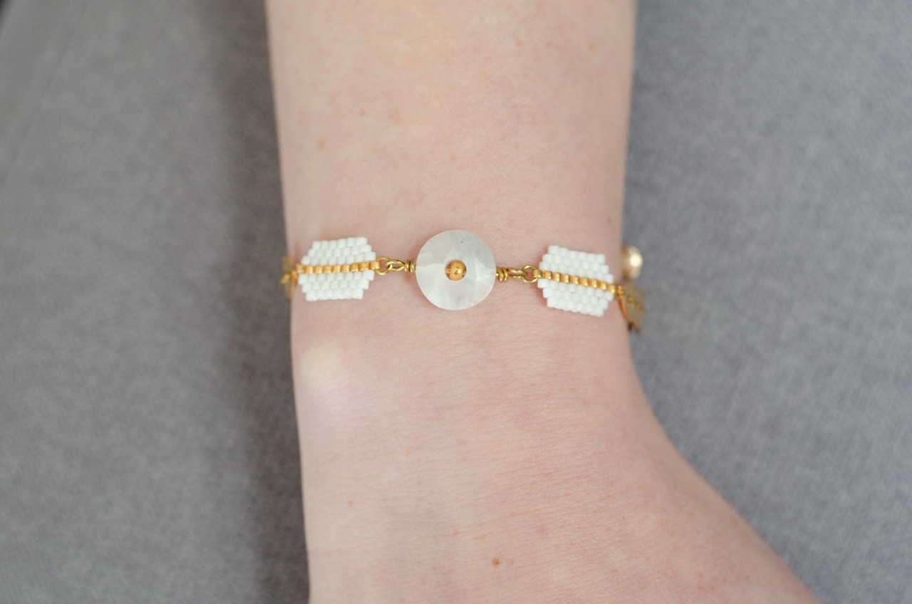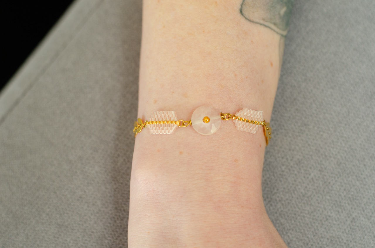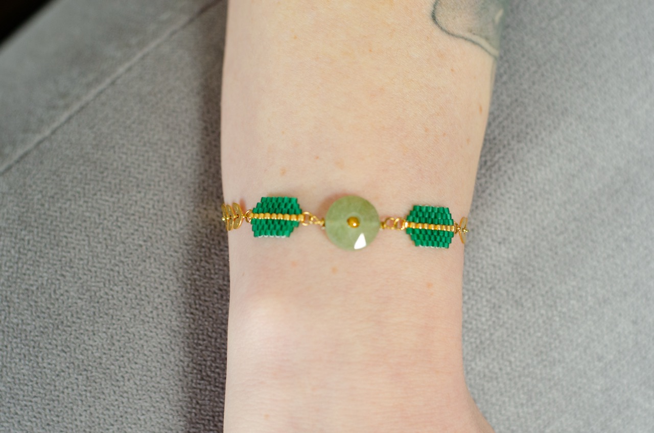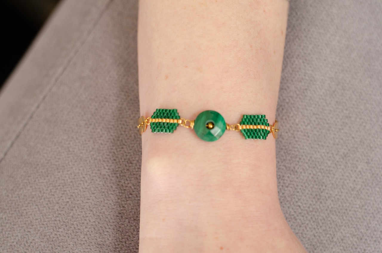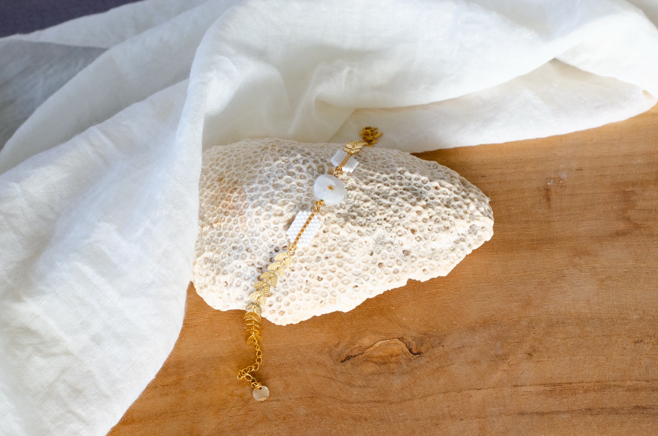 Le bracelet Ava est une création artisanale originale dont le coeur est un cercle en pierre naturelle, encadré par deux tissages de perles japonaises. Le tour de poignet se compose d’une chaîne au motif végétal. Cette association entre la pierre naturelle, le tissage artisanal et le travail du métal offre un contraste saisissant entre tradition et modernité.