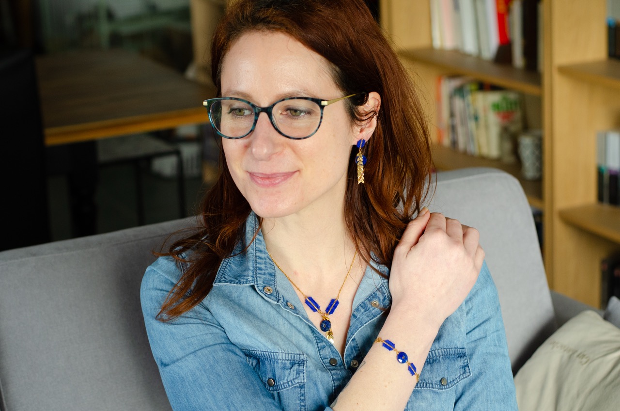 Parure possible avec les boucles d’oreilles pendantes, les boucles d’oreilles puces et le collier à la demande.