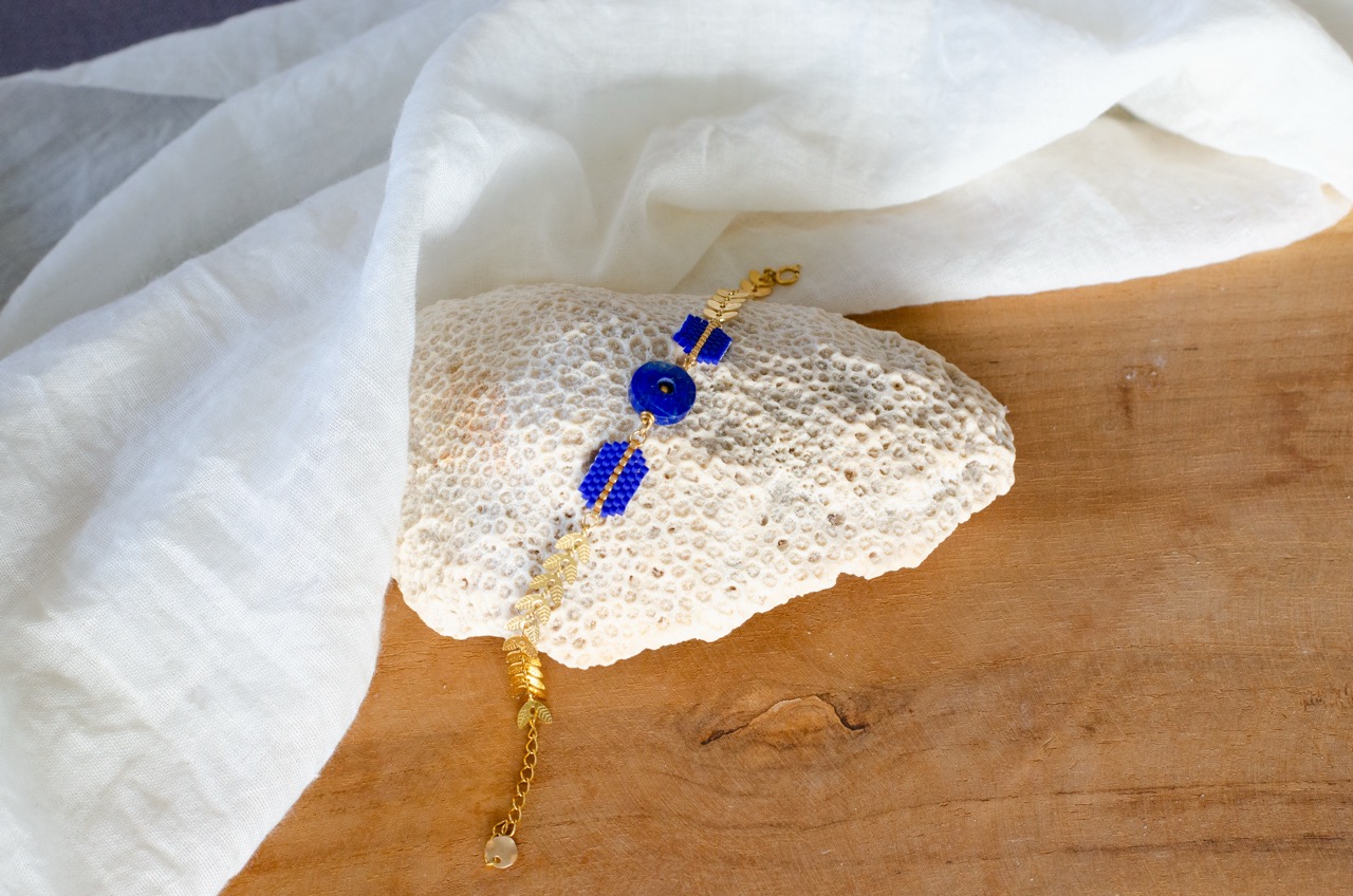 Pour parfaire cette création, une chaîne en acier inoxydable plaqué or reproduisant des motifs d'épis vient prolonger le tissage, apportant une touche d'élégance et de sophistication. Cette combinaison de matériaux nobles et de techniques traditionnelles confère au bracelet Ava une aura délicate, en faisant un véritable bijou d'exception.
