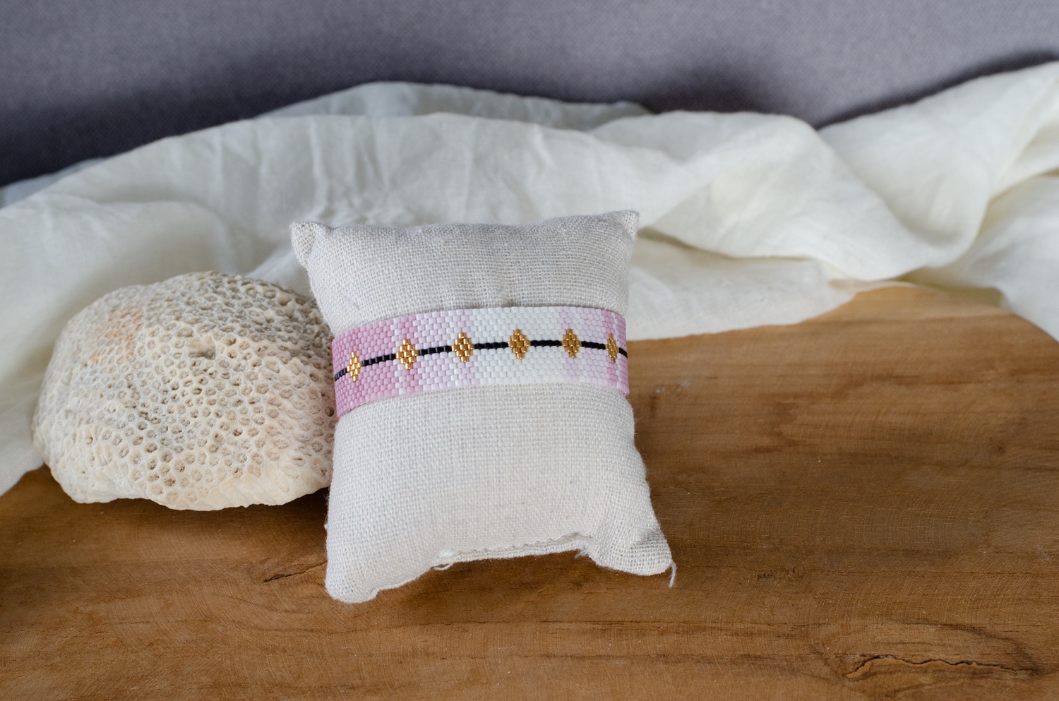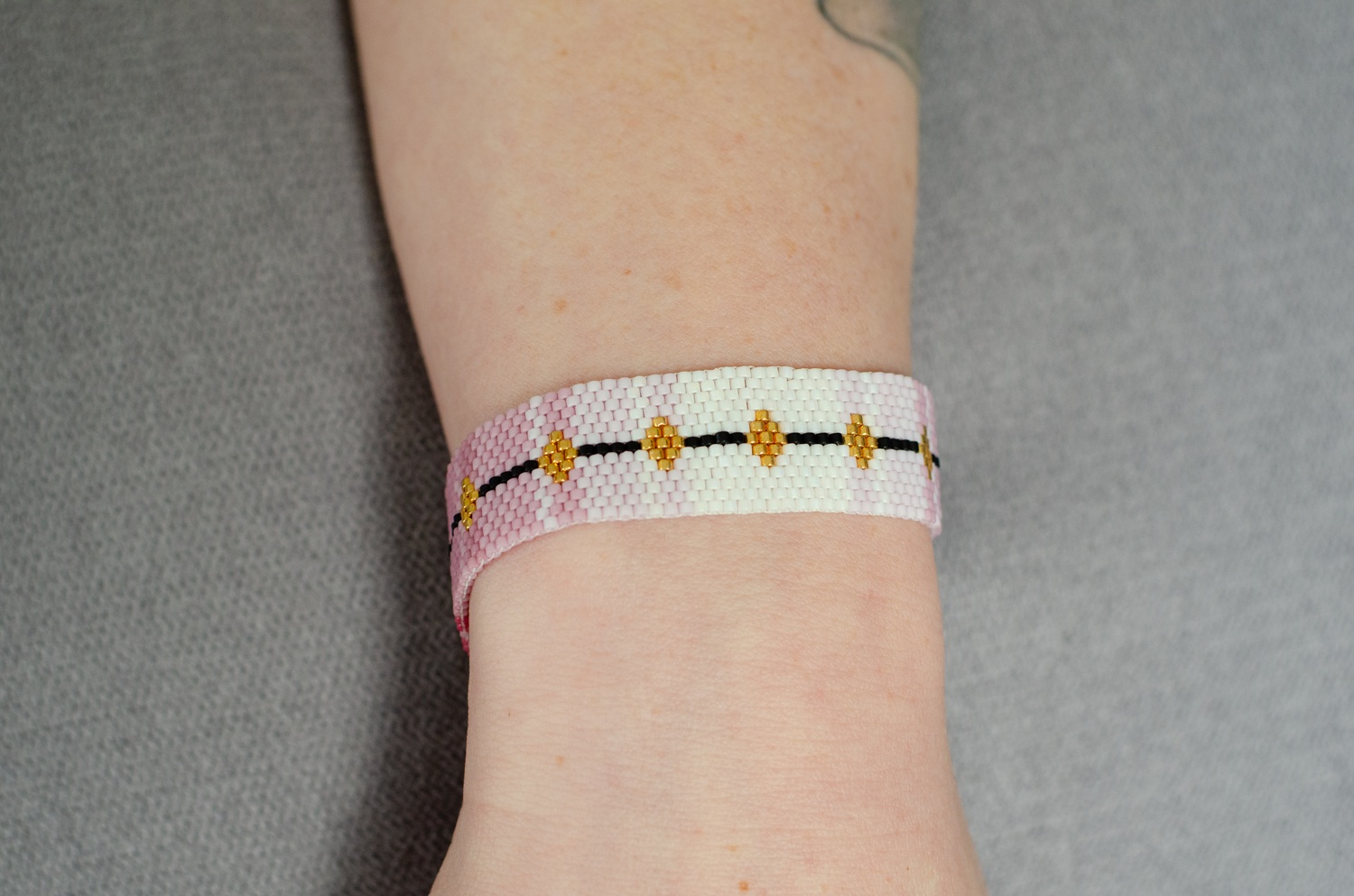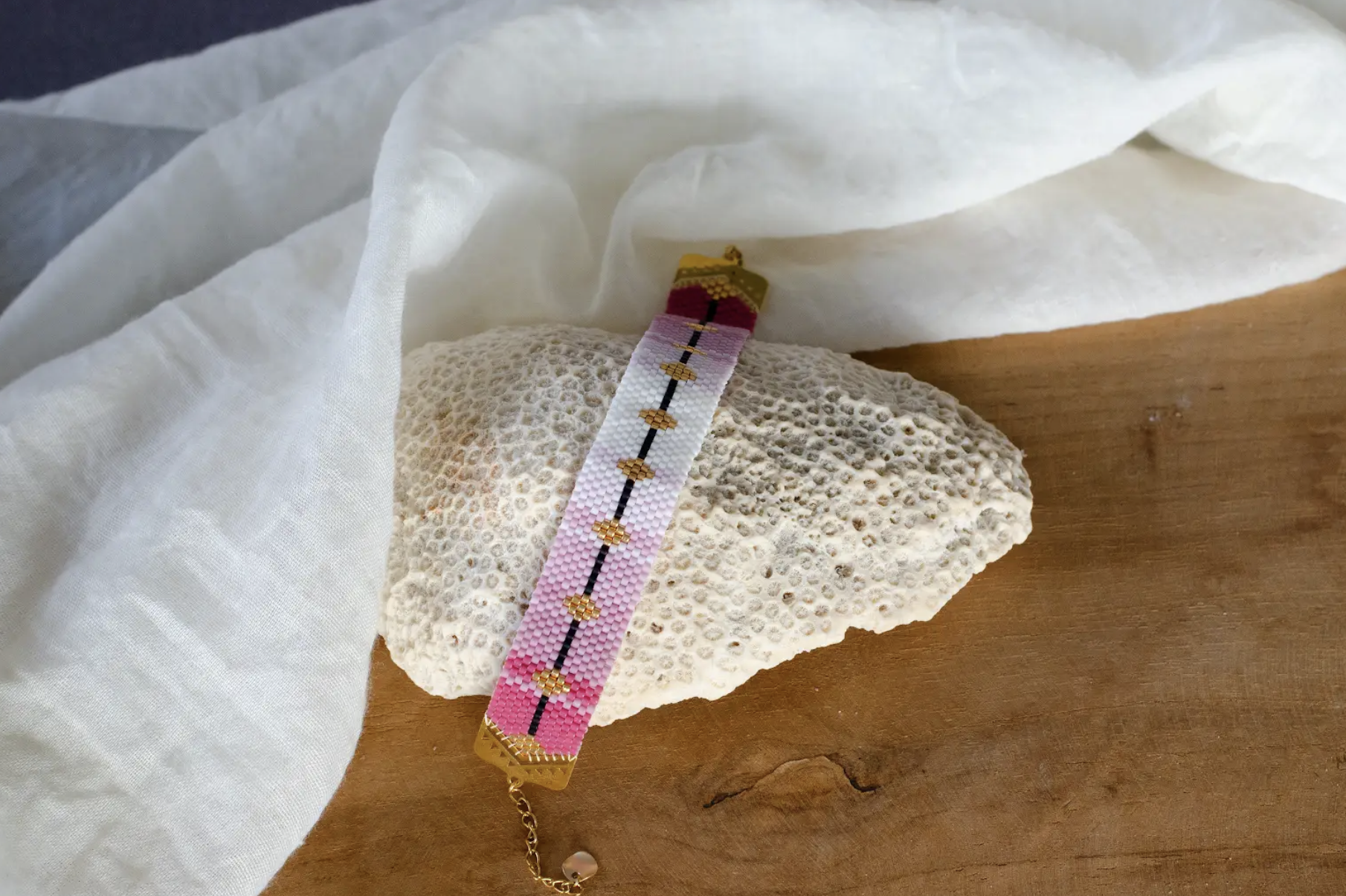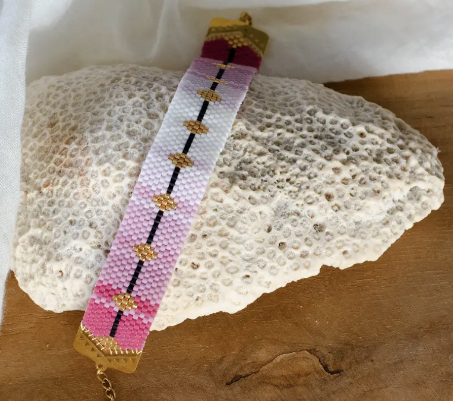Ses teintes tendres, mêlant rose poudré, blanc lumineux et reflets dorés, rappellent les pétales des sakuras en pleine floraison. Ce bracelet associe la beauté naturelle des traditions japonaises tout en apportant une note moderne et raffinée.