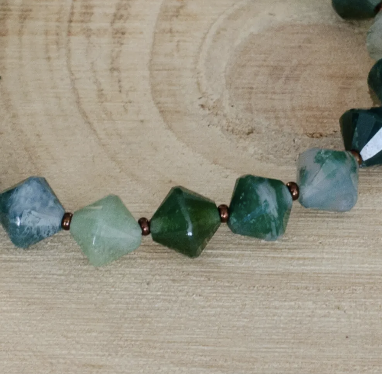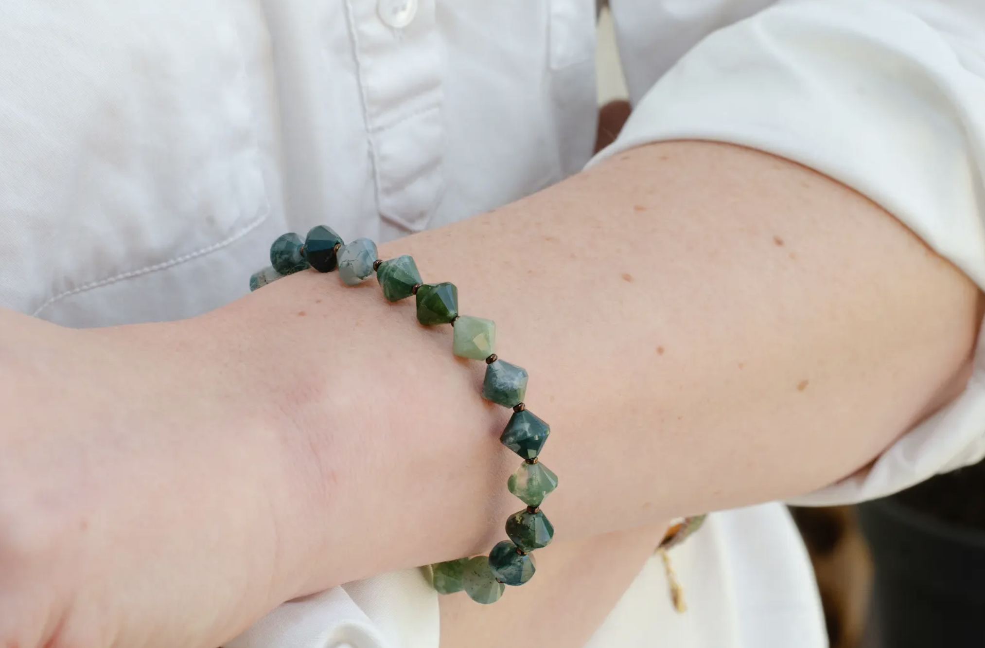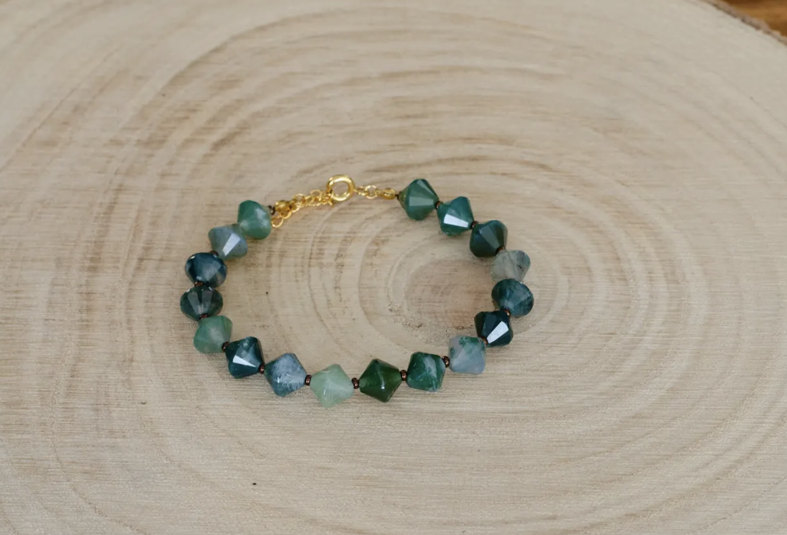 Optez pour l’originalité et l’harmonie avec ce bracelet réalisé à la main et comportant des pierres d’agate mousse en forme de toupies.