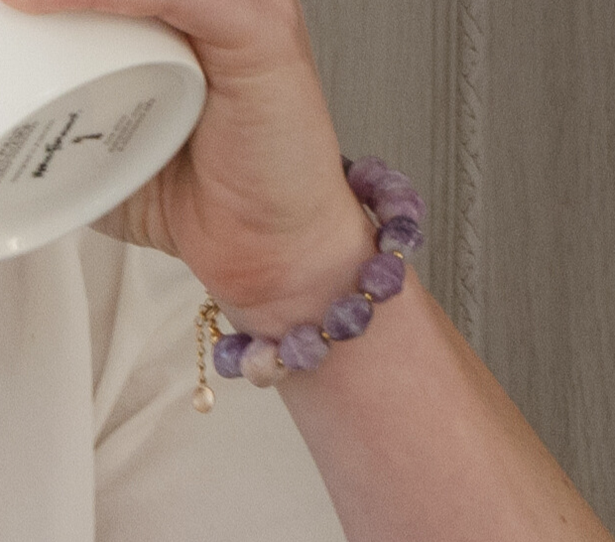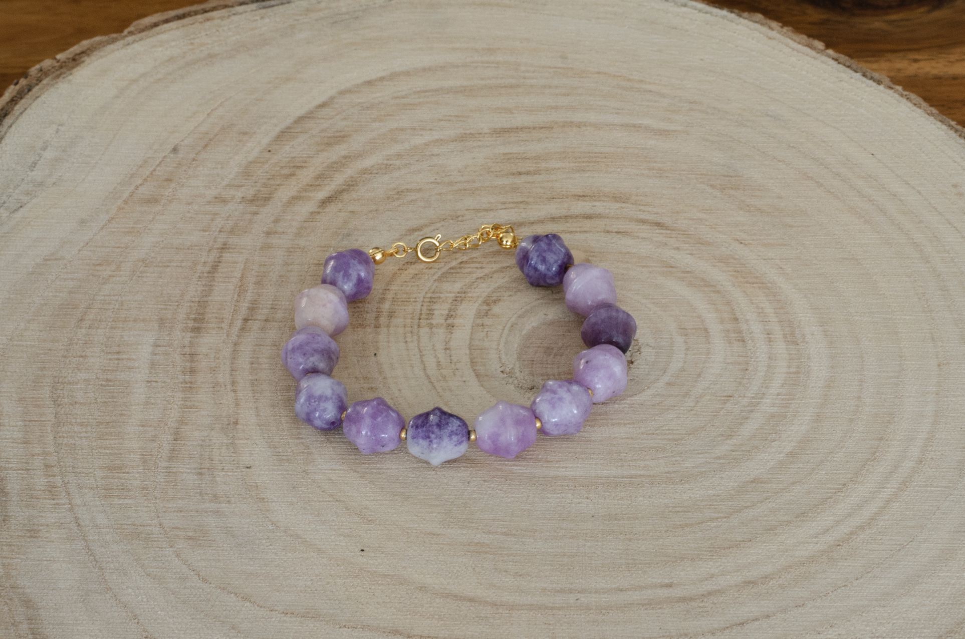 Ce bracelet, par la lépidolite et sa couleur mauve, offre sérénité et calme.