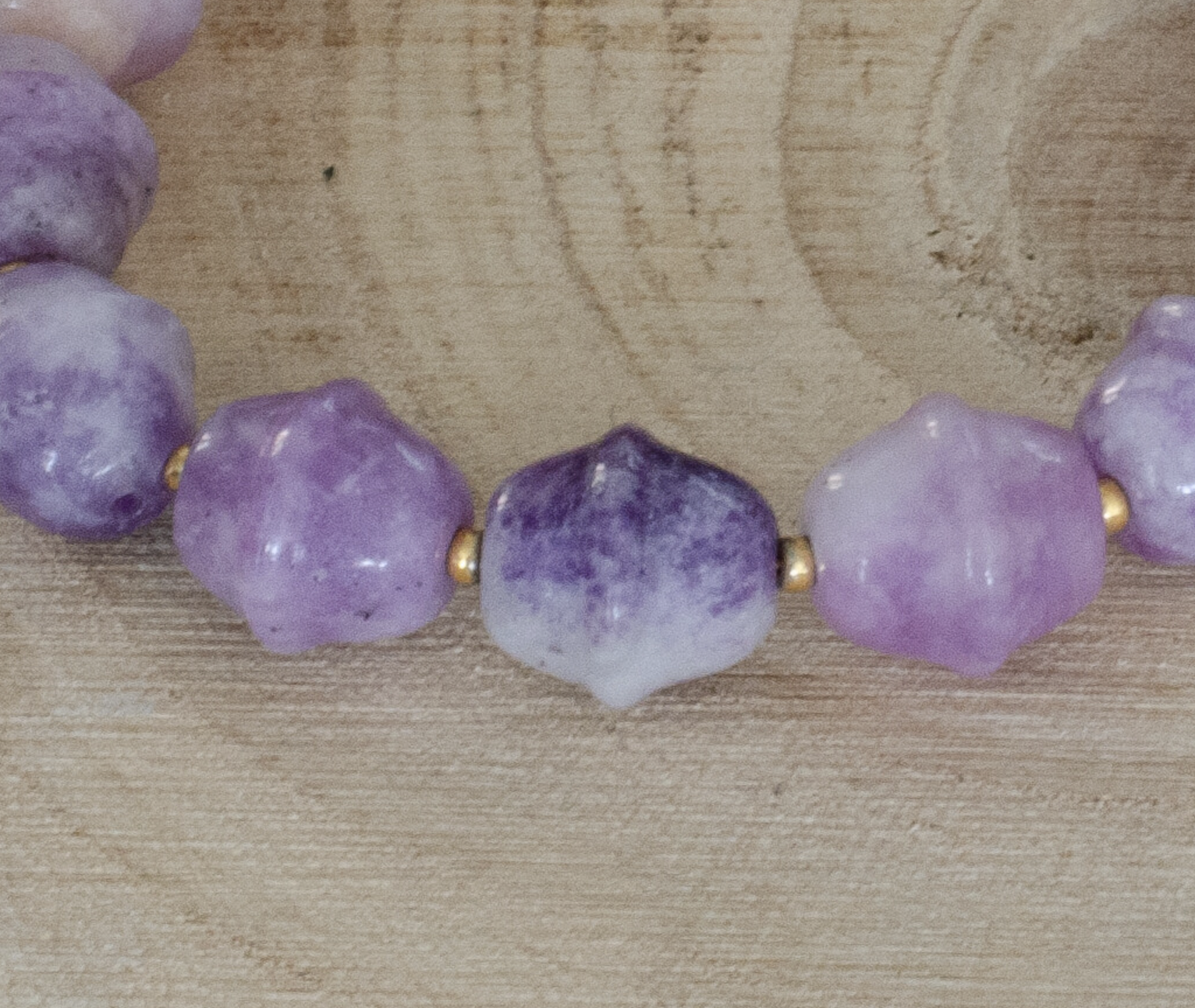 Portez un bracelet original avec ces perles de lépidolite en forme de cloche délicatement séparées par une perle japonaise dorée.