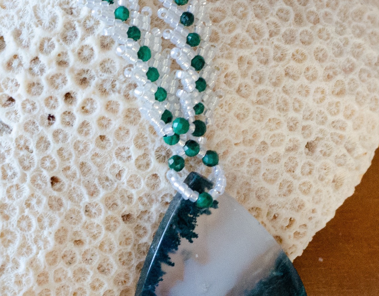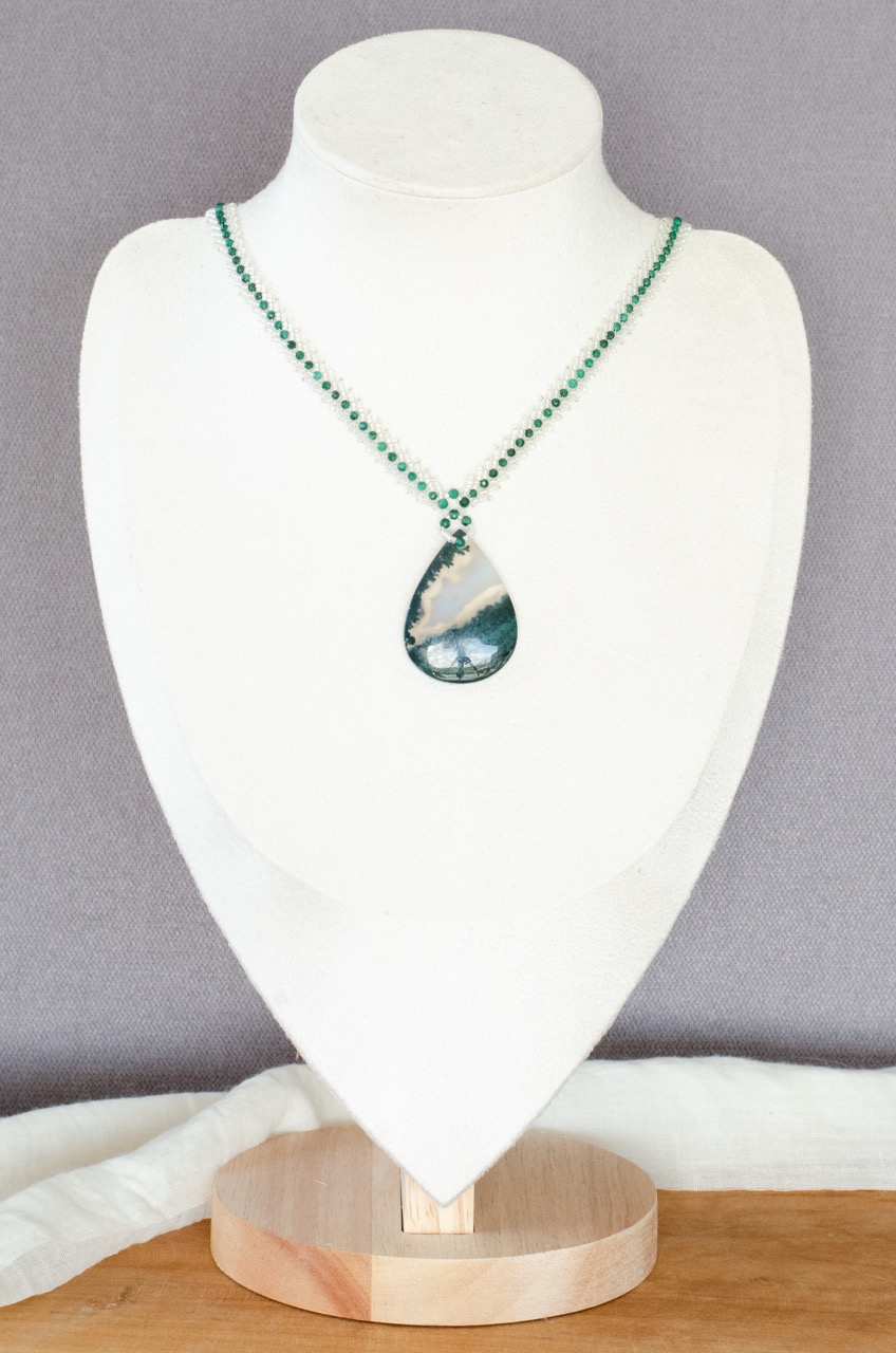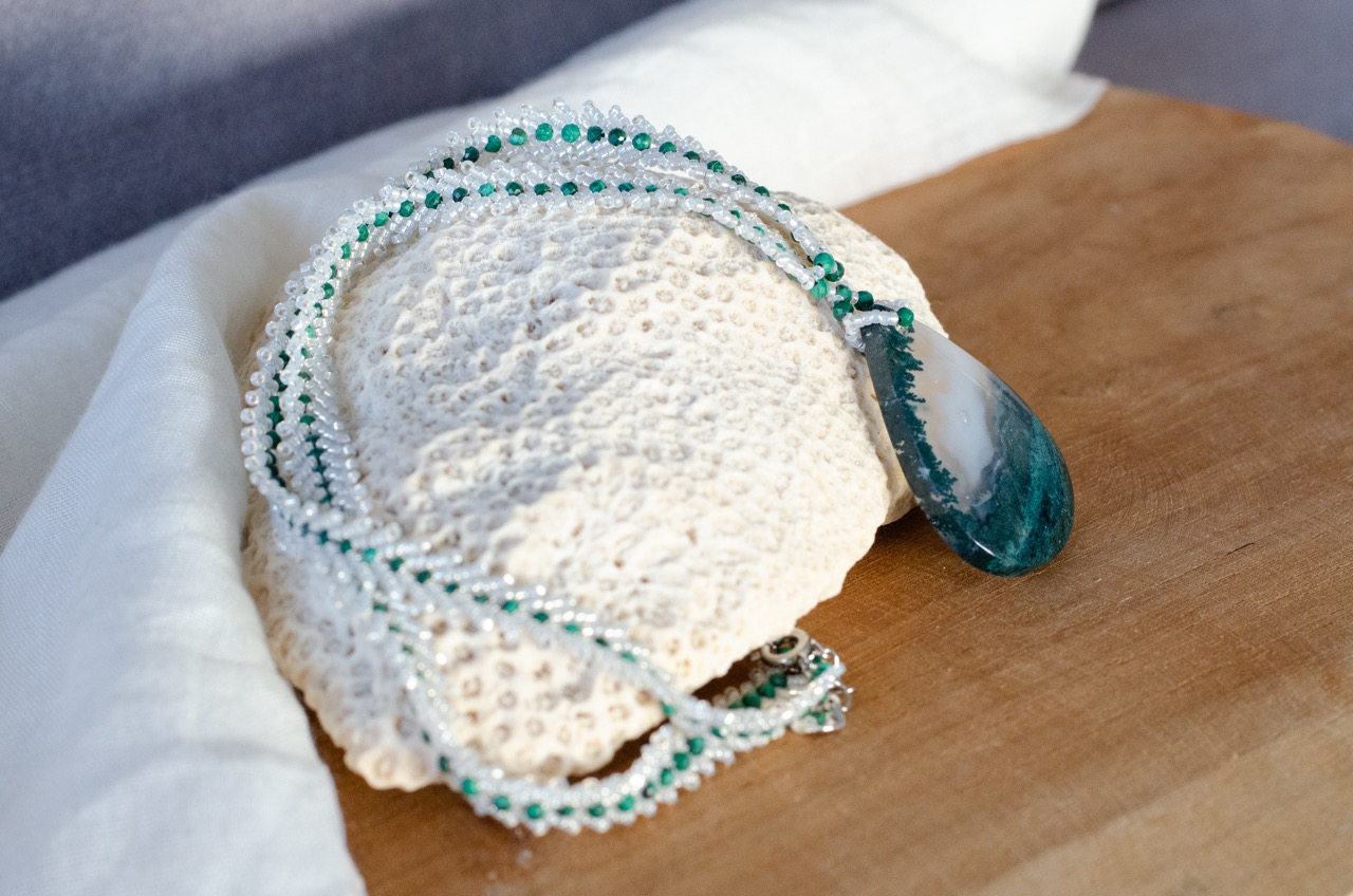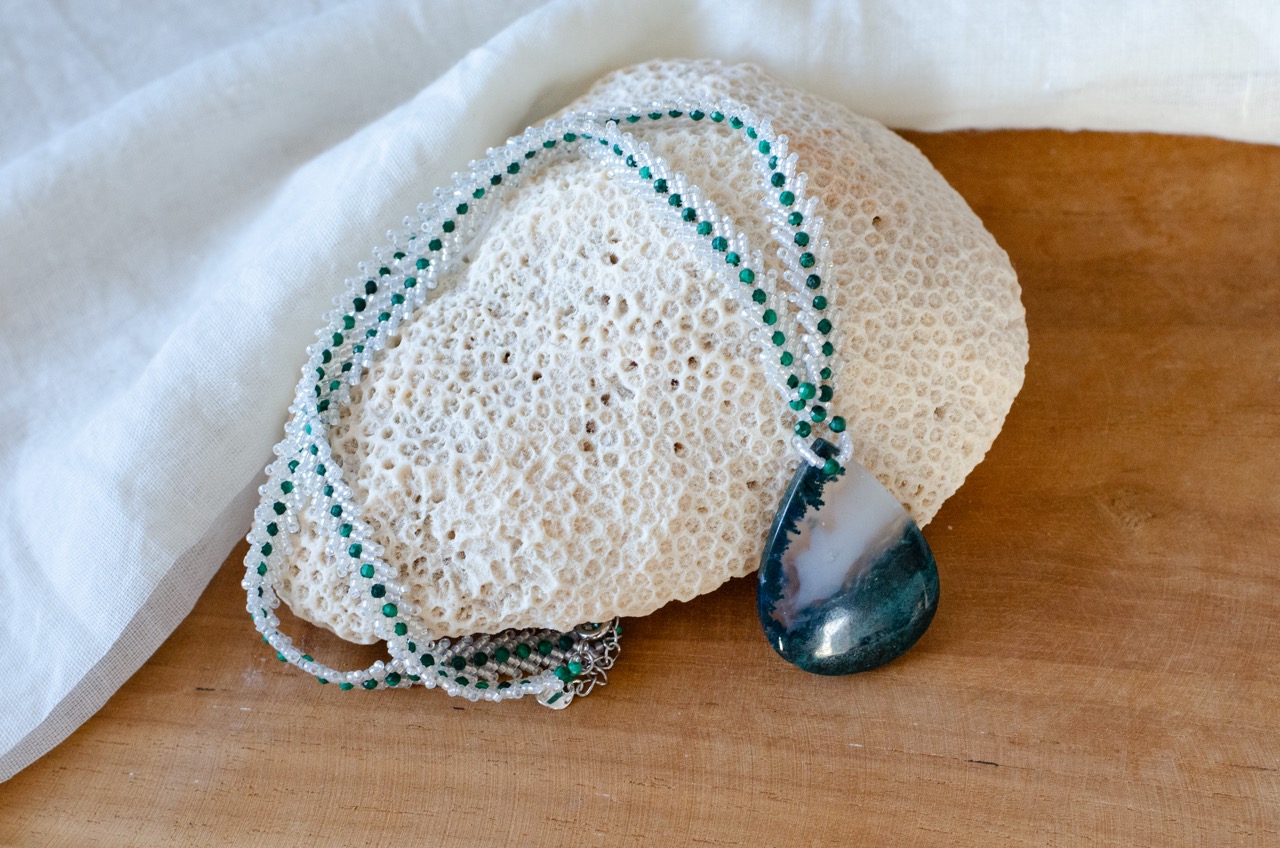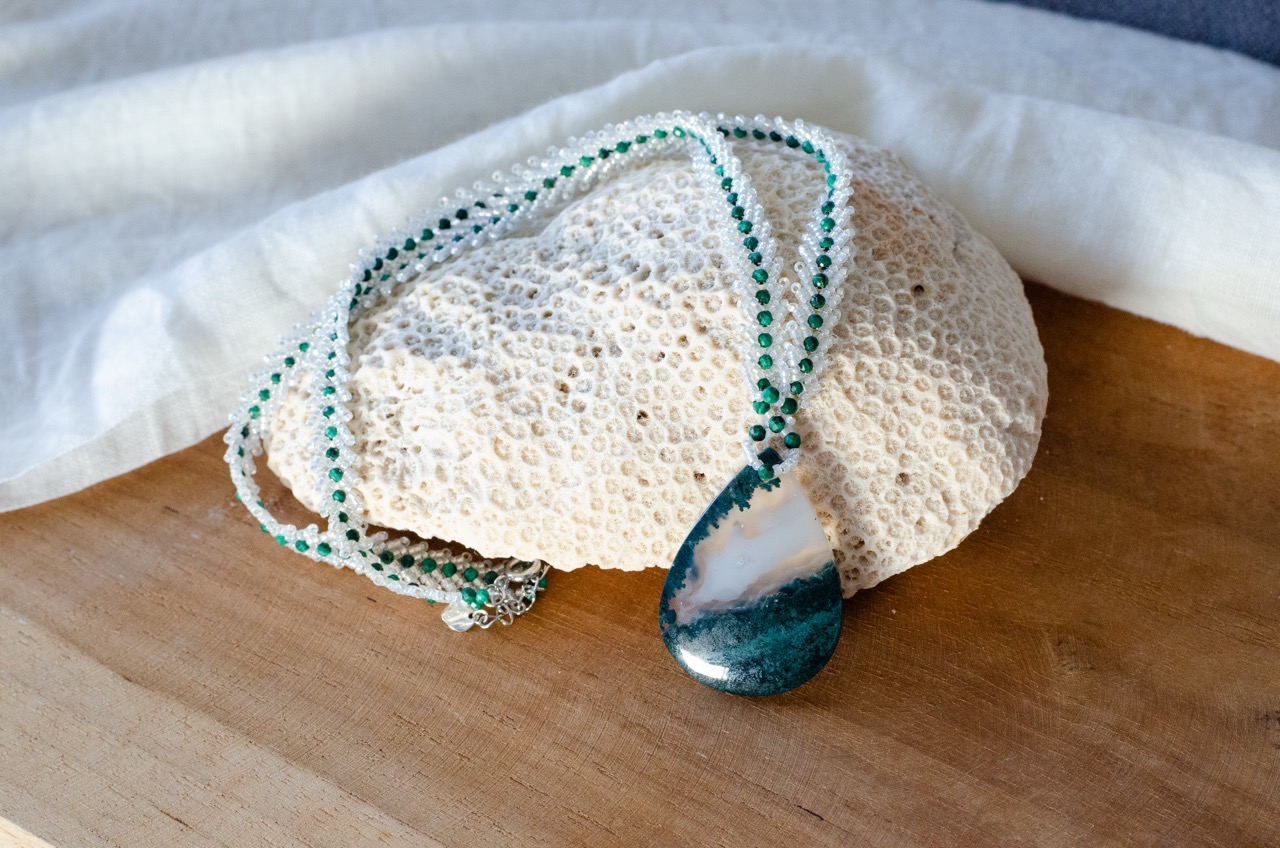 En son cœur, de profondes perles de malachite viennent souligner l’ensemble. Leurs nuances vert intense et leurs motifs naturels créent un contraste raffiné et puissant avec la douceur de l’agate mousse, renforçant le lien avec la nature et l’énergie du vivant.