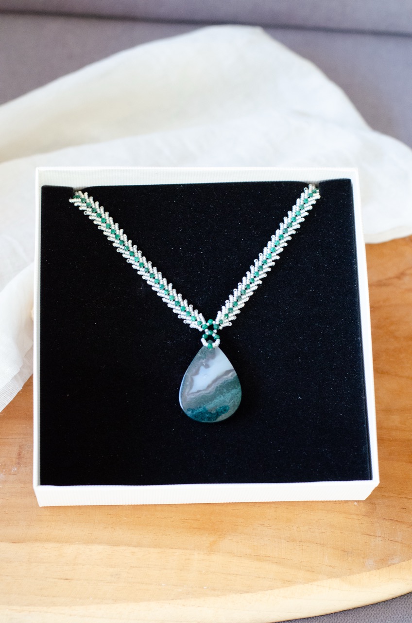 Au centre de ce bijou, une agate mousse en forme de goutte dévoile un paysage végétal fascinant. Ses inclusions vertes, semblables à de fines mousses ou à des feuillages suspendus dans la pierre, évoquent une nature vivante et apaisante. Chaque agate mousse est unique, comme un fragment de forêt à porter sur soi.