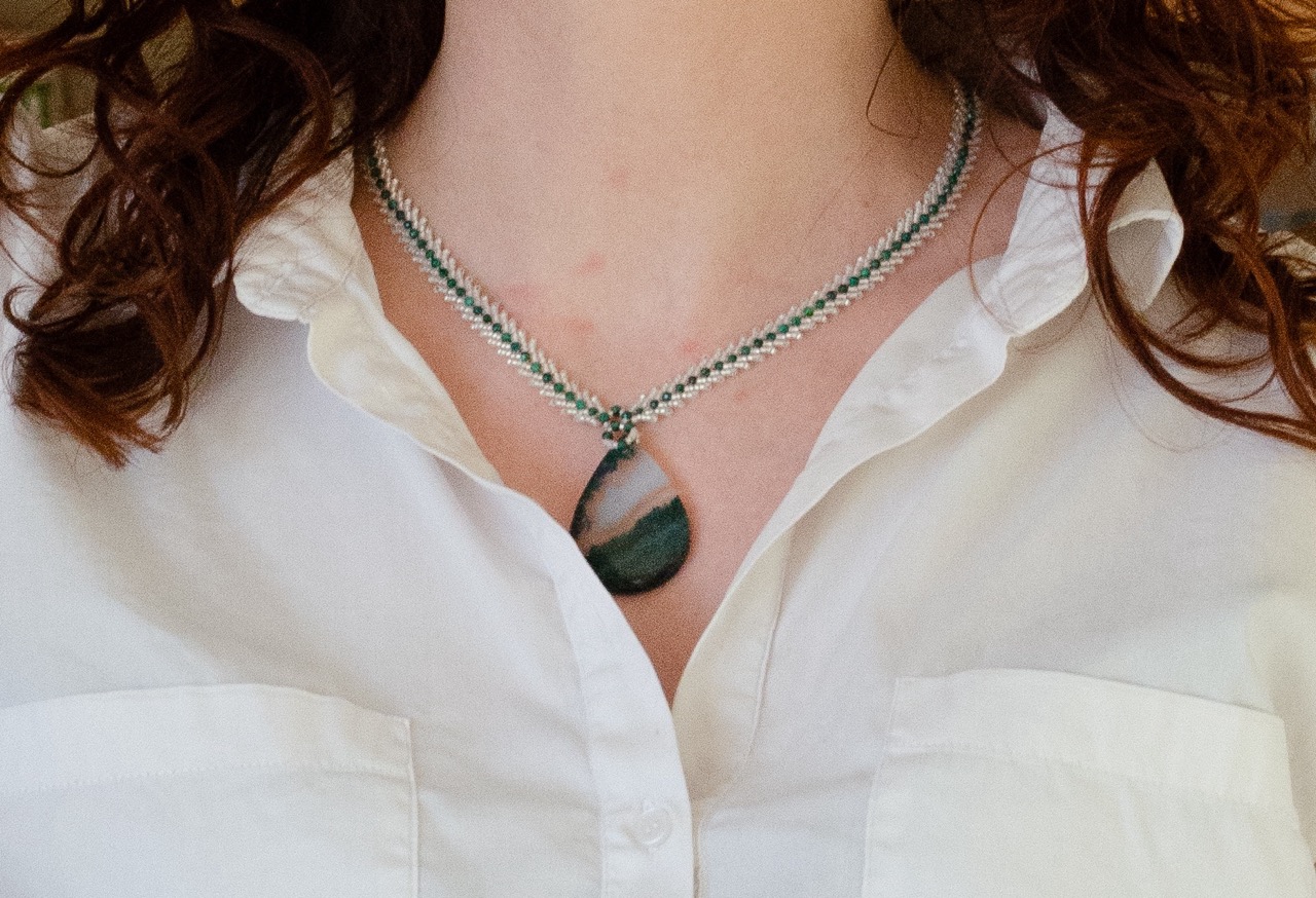 Le tour de cou, entièrement tissé à la main en maille Singapour avec des perles japonaises, apporte structure et légèreté à la pièce. Son tissage délicat épouse le cou avec élégance et met en valeur la pierre centrale avec subtilité.