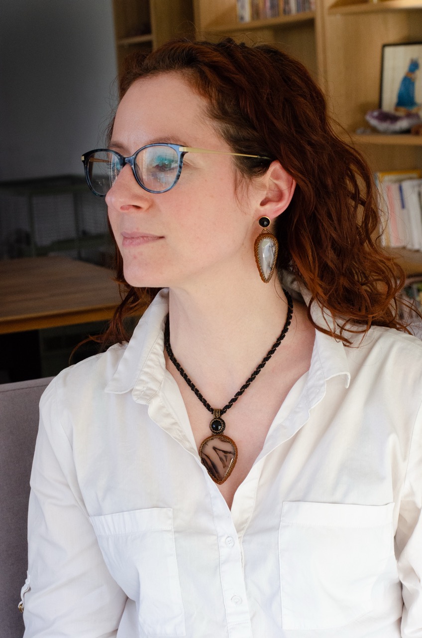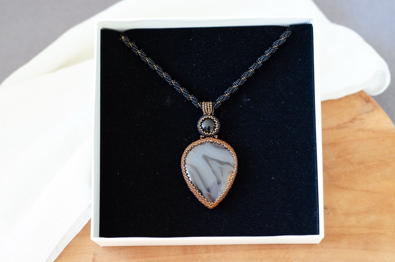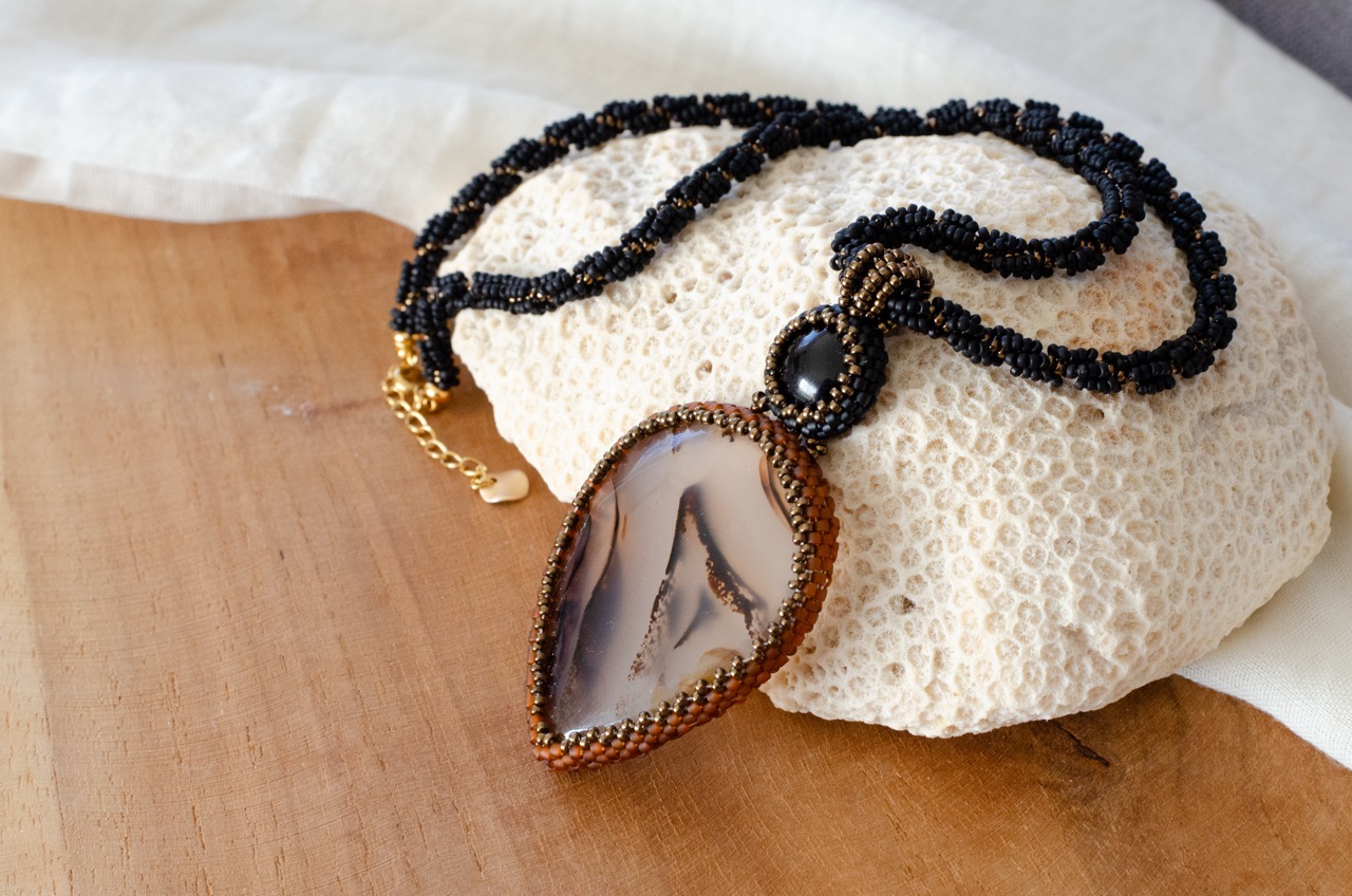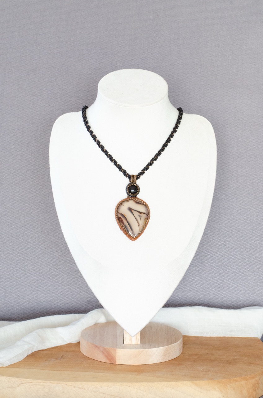 Au cœur de ce bijou, une agate du Montana en forme de goutte inversée révèle toute sa poésie minérale. Ses nuances translucides, mêlant douceur et profondeur dans des tons marron délicats, captent la lumière avec subtilité. Elle est délicatement sertie à la main de perles japonaises, soulignant sa silhouette et lui apportant une touche précieuse.