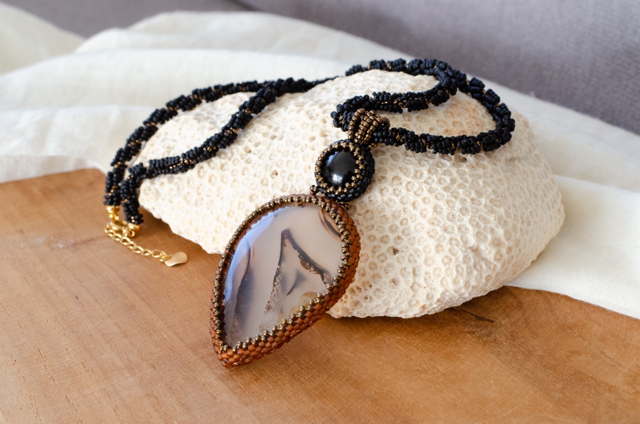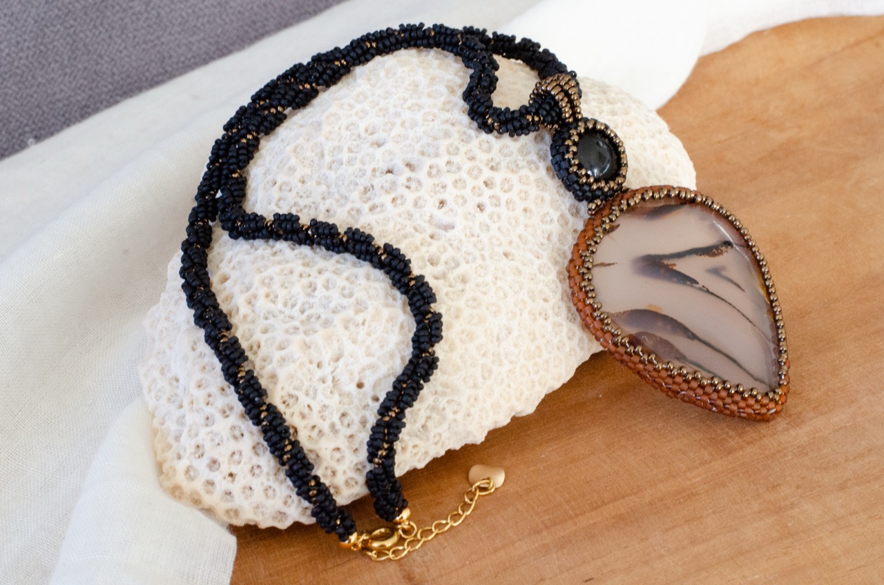 En contraste, une obsidienne noire ronde, intense et mystérieuse, vient équilibrer la composition. Elle aussi est sublimée par un sertissage en perles japonaises, créant un dialogue harmonieux entre clarté et profondeur.