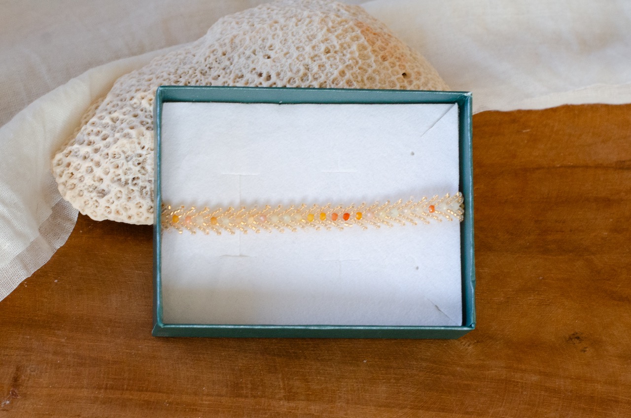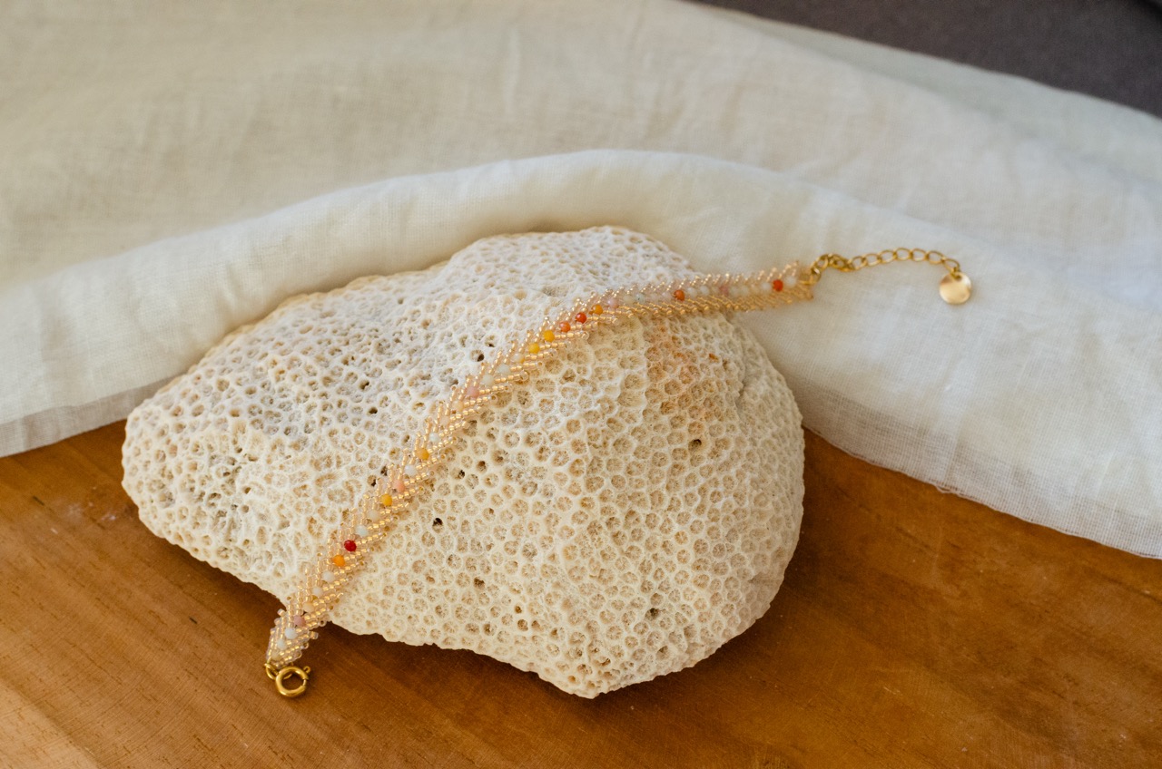 Entièrement tissé à la main en maille Singapour avec des perles japonaises, ce bracelet révèle un jeu de lumière subtil et raffiné. Sa texture délicate capte les reflets à chaque mouvement, apportant élégance et fluidité au poignet.