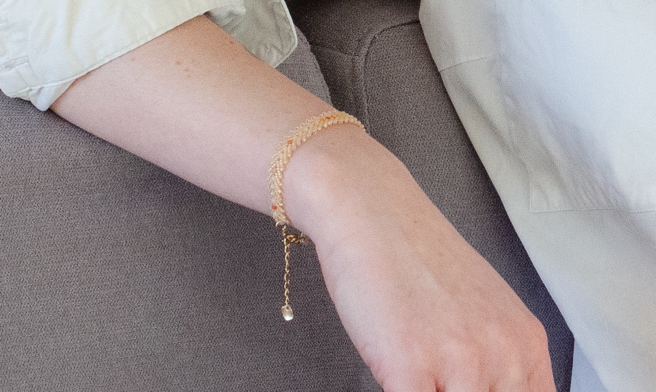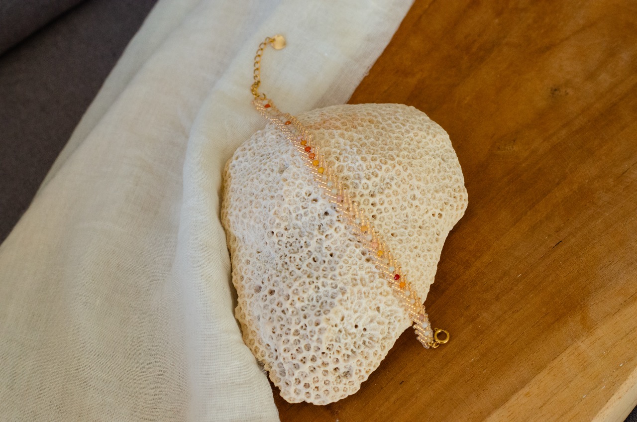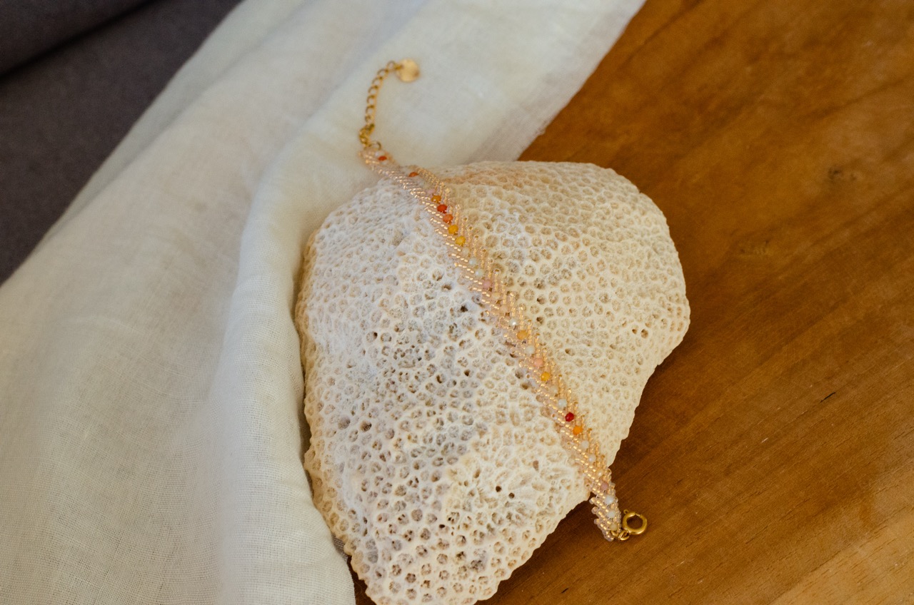 Au centre de la composition, de fines perles en pierres naturelles viennent ponctuer le tissage. Chacune d’elles possède ses propres nuances et vibrations, apportant une dimension unique et personnelle à la pièce. Elles créent un contraste harmonieux avec la structure du tissage, pour un rendu à la fois moderne et intemporel.