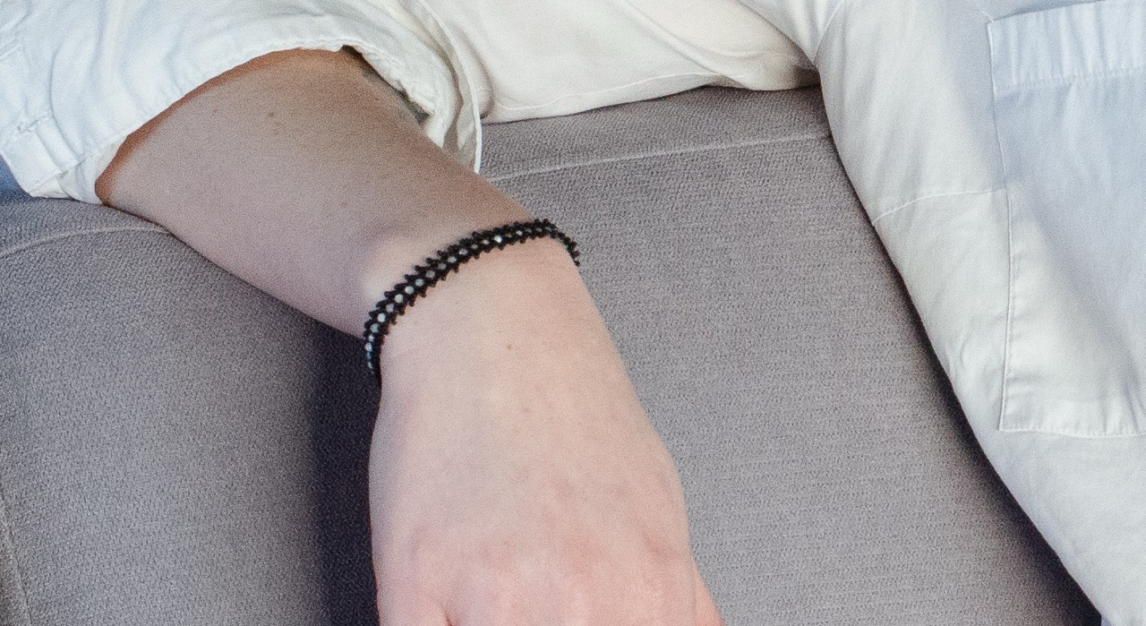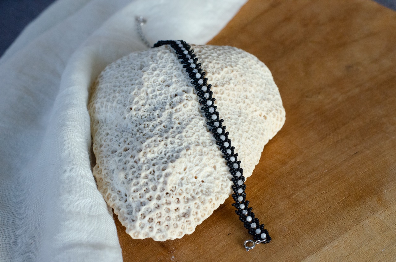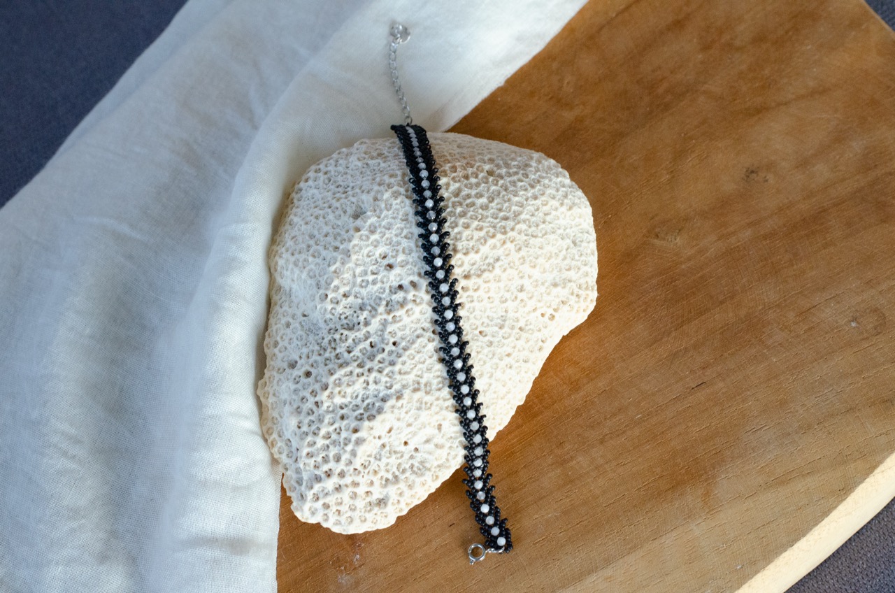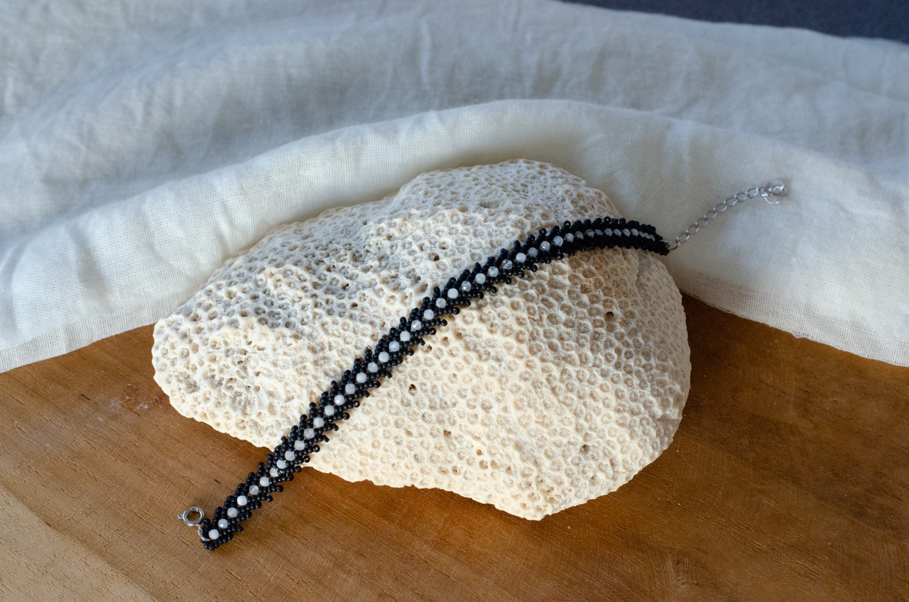 Entièrement tissé à la main en maille Singapour avec des perles japonaises, ce bracelet révèle un jeu de lumière subtil et raffiné. Sa texture délicate capte les reflets à chaque mouvement, apportant élégance et fluidité au poignet.