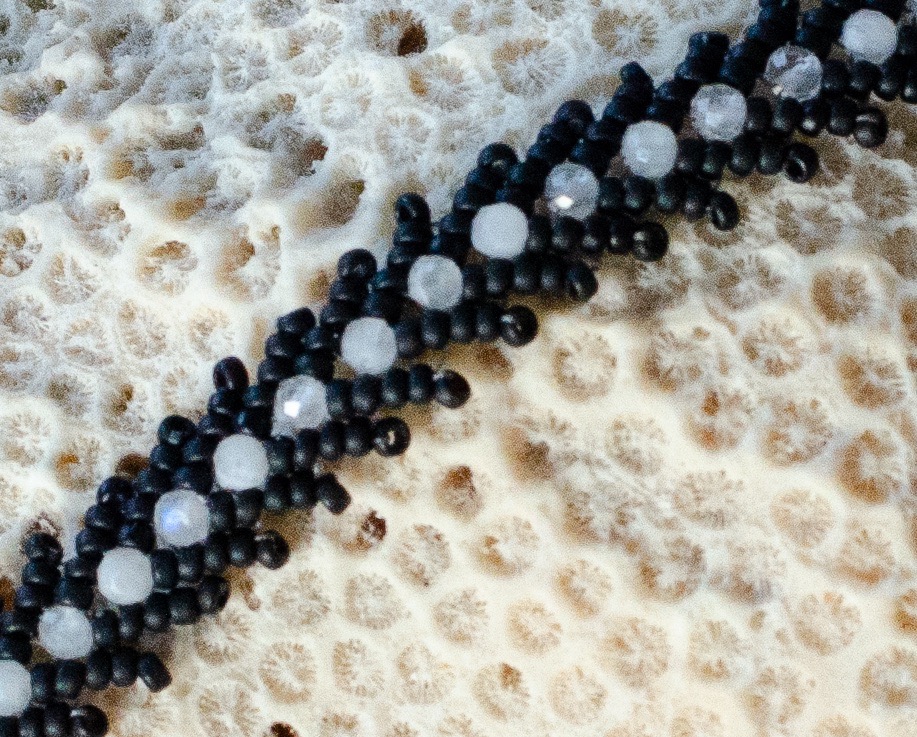 Au centre de la composition, de fines perles en pierres naturelles viennent ponctuer le tissage. Chacune d’elles possède ses propres nuances et vibrations, apportant une dimension unique et personnelle à la pièce. Elles créent un contraste harmonieux avec la structure du tissage, pour un rendu à la fois moderne et intemporel.