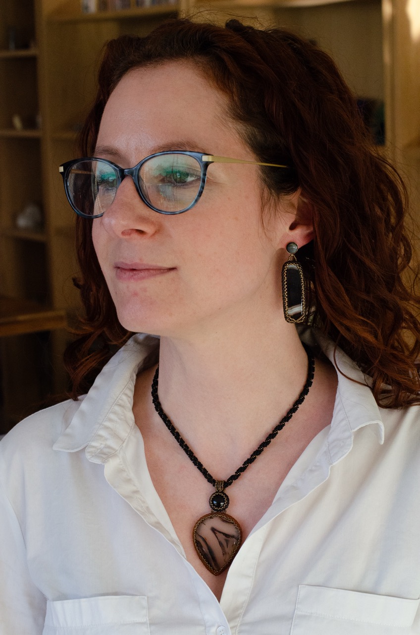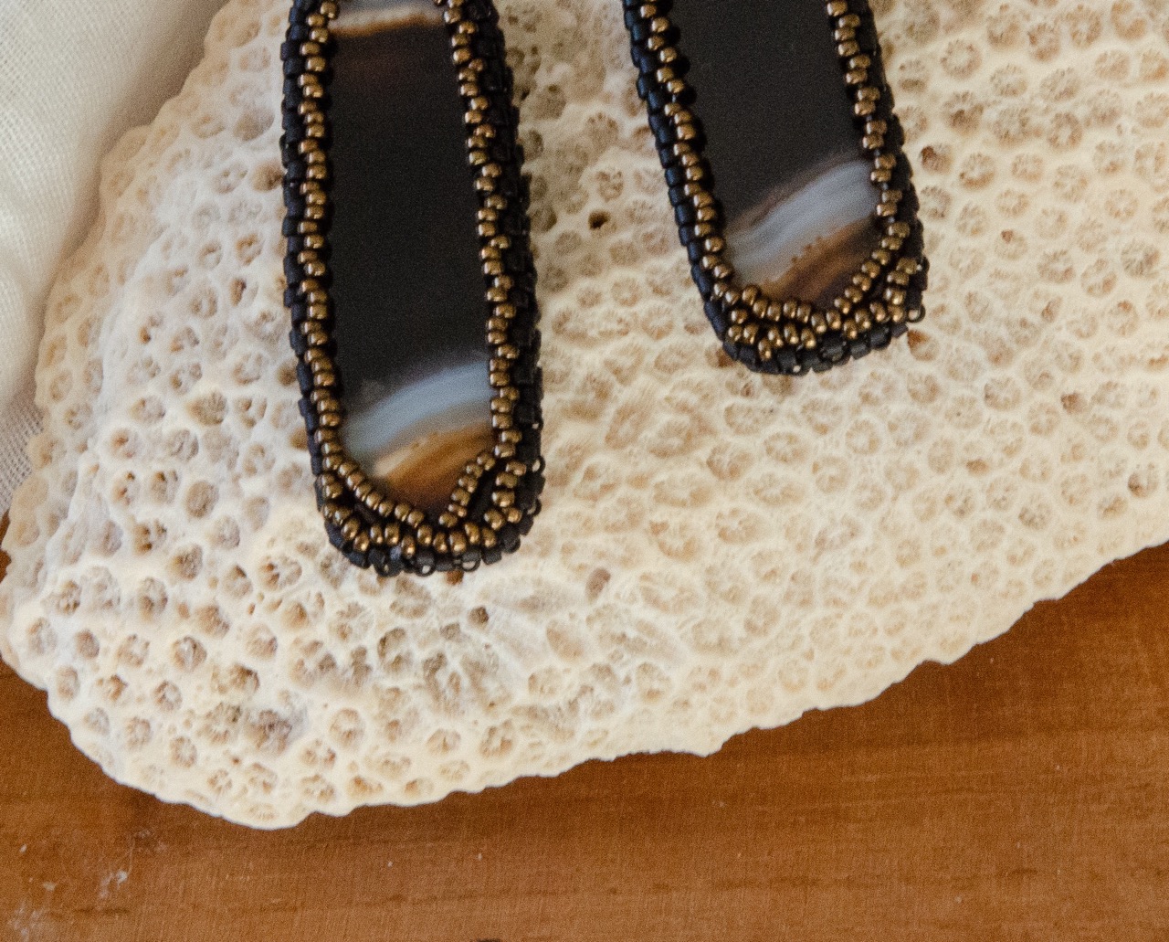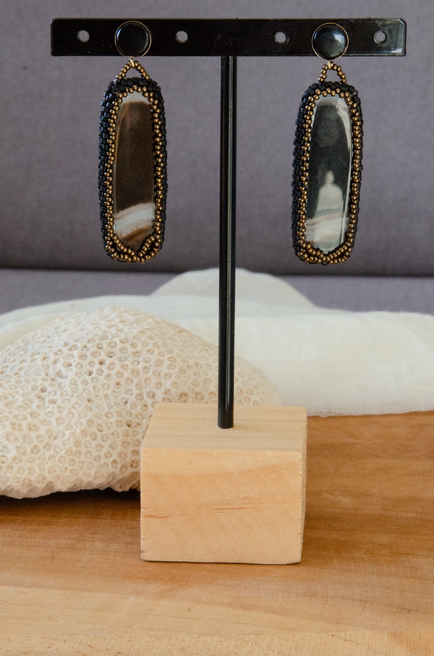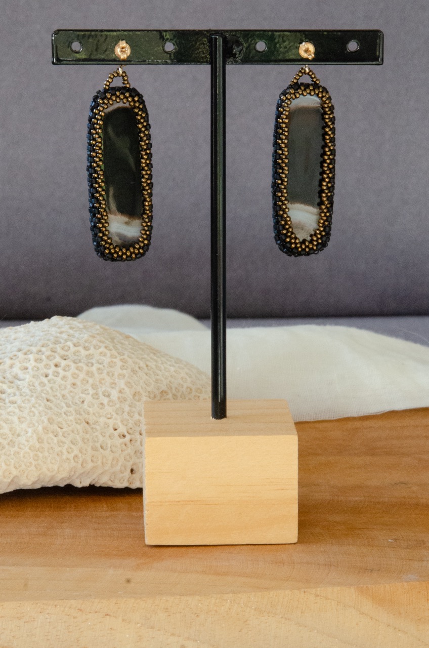 Au-dessus de chaque agate, une pierre d’onyx noir vient renforcer la profondeur de la composition. Son éclat intense crée une continuité élégante avec les teintes sombres de l’agate, pour un rendu harmonieux et résolument chic.