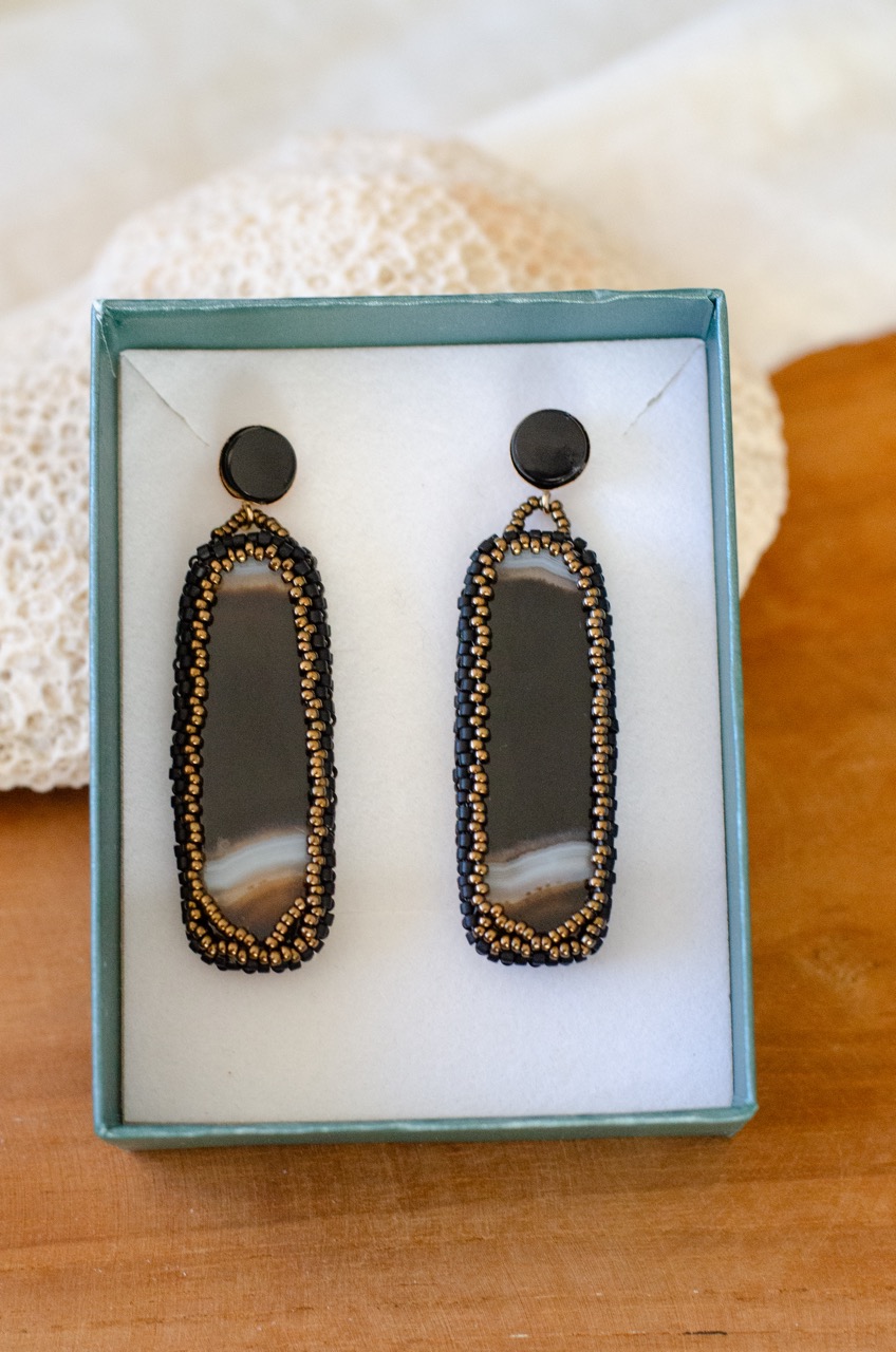 Au cœur de chaque boucle, une agate du Botswana taillée en forme rectangulaire dévoile un jeu de lignes délicates. Ses nuances profondes de noir, ponctuées de stries blanches et marron, créent un motif graphique unique, presque hypnotique. Chaque pierre raconte sa propre histoire minérale, entre douceur et caractère.
