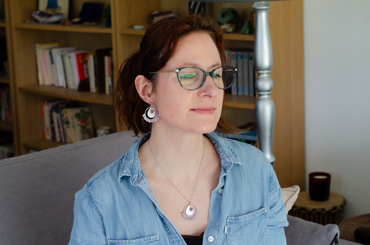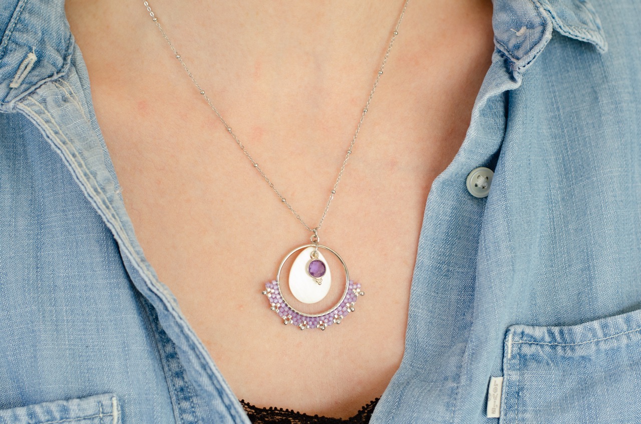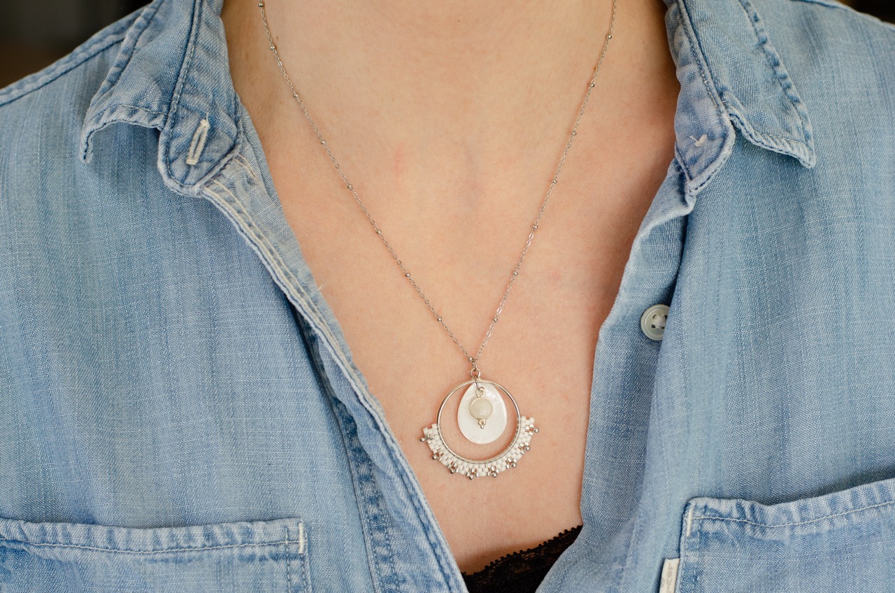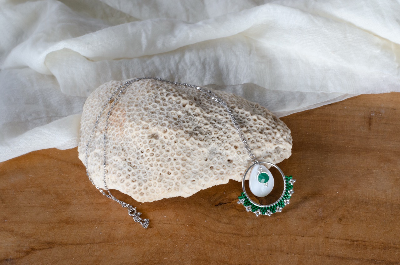 Au cœur de cette composition, une goutte de nacre capte la lumière et apporte une touche de pureté. Elle accueille une délicate breloque renfermant une pierre naturelle, comme un trésor discret à porter près de soi.